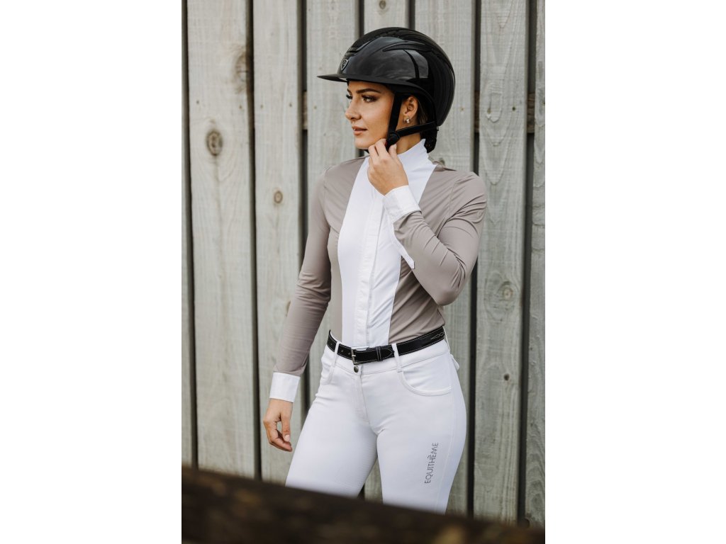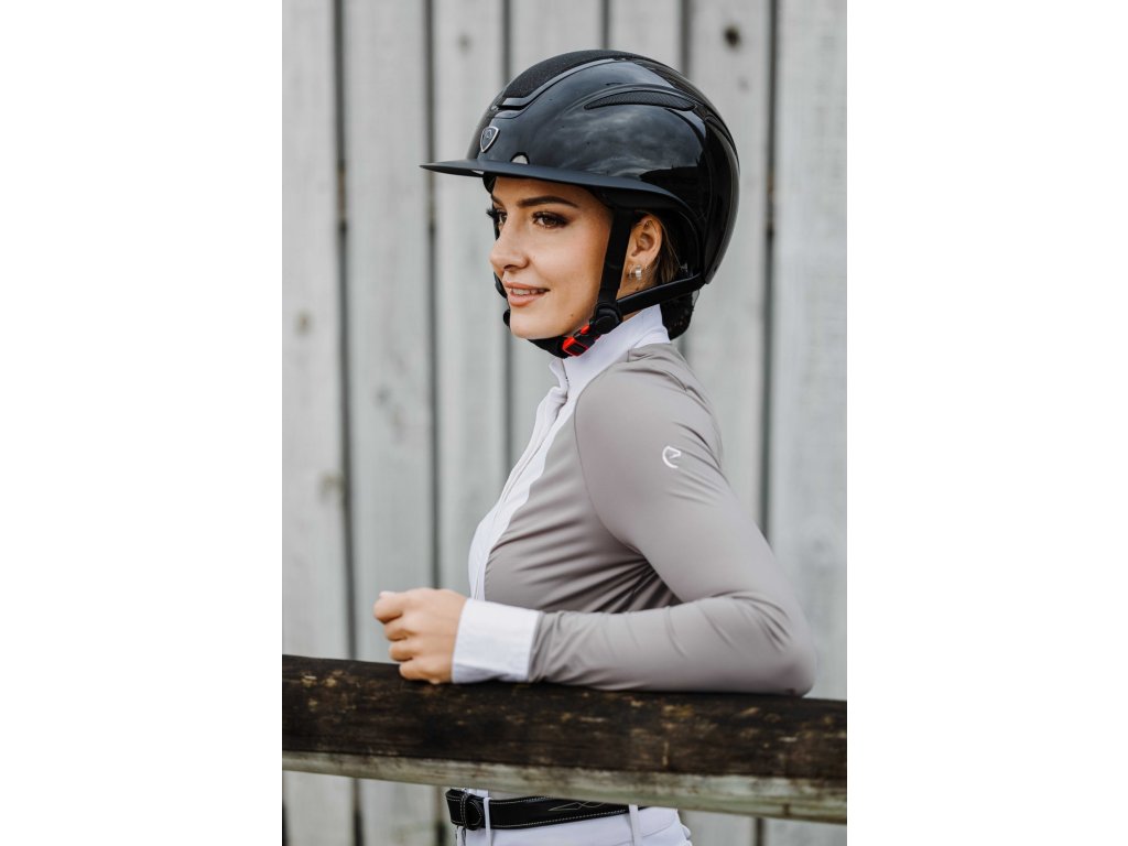 Súťažná košeľa spája rafinovanú eleganciu s výnimočným pohodlím. Vďaka ľahkej a pružnej hlavnej tkanine ponúka maximálnu voľnosť pohybu a príjemný pocit po celý deň. Rýchloschnúci materiál zaisťuje optimálnu tepelnú reguláciu a zároveň poskytuje ochranu pred UV žiarením. Košeľa je navrhnutá s dôrazom na funkčný dizajn. Nechýba biely kontrastný golier s elastickým rebrovaním, celoprepínacie zapínanie na gombíky ani priehľadné sieťované panely na rukávoch a chrbte, ktoré zaisťujú lepšiu ventiláciu. Dlhé rukávy poskytujú plné zakrytie a zároveň podporujú prúdenie vzduchu. Golier a lemy rukávov v popelínovej úprave dodávajú sofistikovaný košeľový efekt, zatiaľ čo diskrétne logo na rukáve podčiarkuje elegantný charakter modelu. Priliehavý strih navyše vytvára modernú a čistú siluetu.
