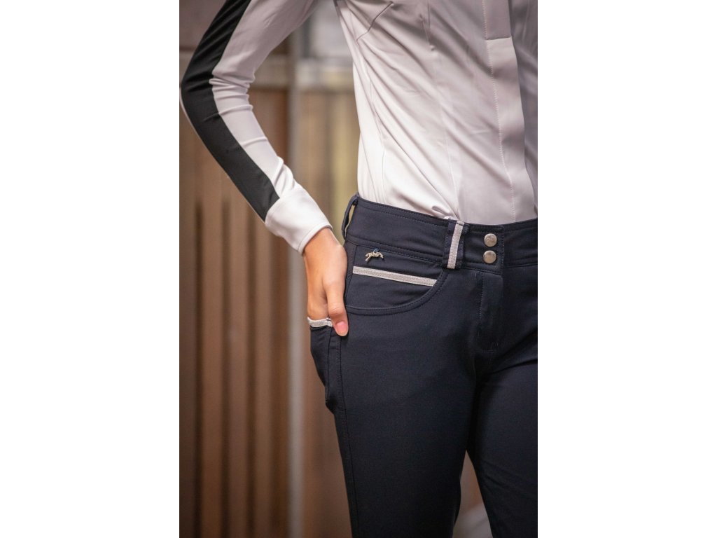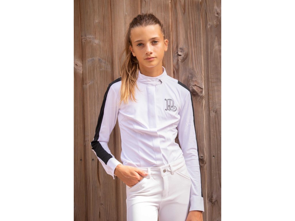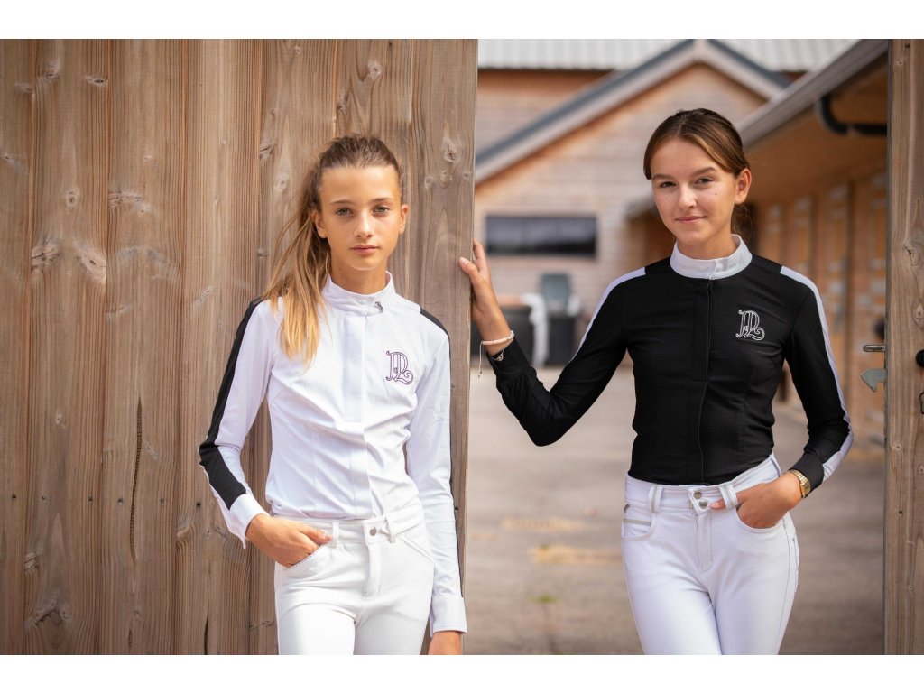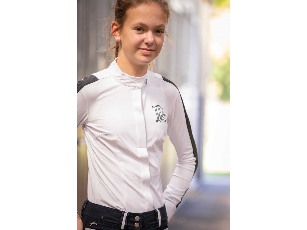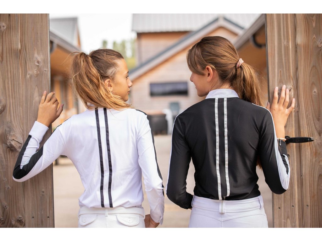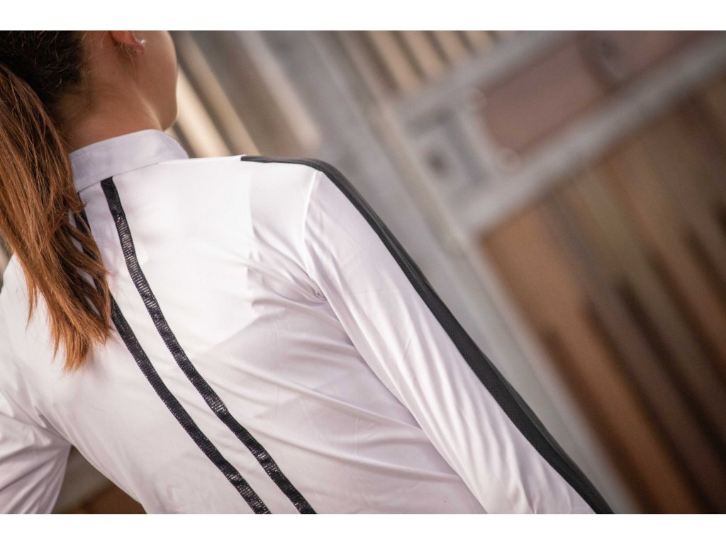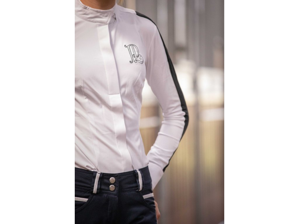 Elegantná košeľa na preteky s dlhým rukávom, ktorá perfektne sadne pod sako na preteky. Jemná a priedušná látka so vzorom včelieho plástu sa prispôsobí telu a skvele ladí s rajtkami. Zapína sa na gombíky skryté pod ozdobnou légou. Na ramenách a pozdĺž rukávov je kontrastný biely pruh zo sieťovanej látky, ktorá zaisťuje skvelú priedušnosť a pohodlie pri nosení. Na chrbte vedú dva tenké biele prúžky, ktoré dodávajú originálny vzhľad a pekne zvýrazňujú líniu chrbta. Stojačik je mierne nižší ako obvykle a zdobí ho malý strieborný prívesok s logom Penelope.