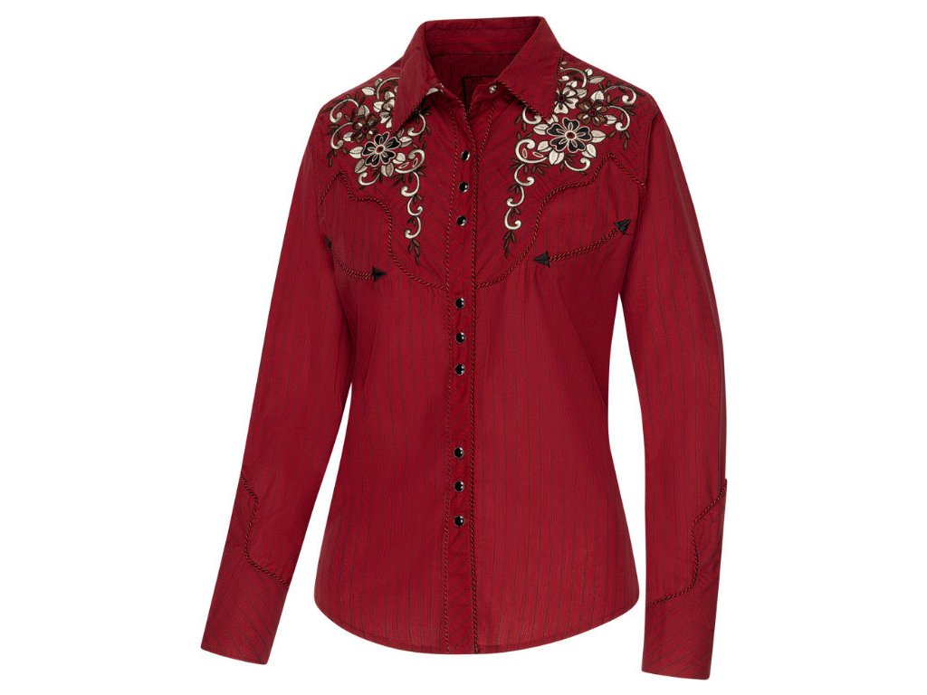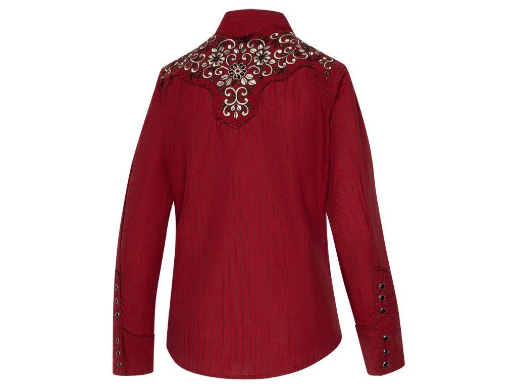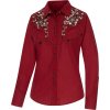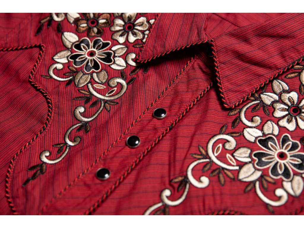 Westernová košeľa s krásnou kvetinovou výšivkou na hrudi a na chrbte. Výšivku dopĺňa dvojfarebná paspulka. Zapínanie na patentky v čiernej farbe krásne ladí s patentkami na rukávoch. Košeľa kombinuje pohodlie a funkčnosť a navyše má lichotivý strih.