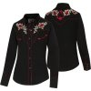 Krásna westernová dámska blúzka s dvojfarebnou výšivkou na hrudi a na chrbte. Westernový motív dopĺňa dvojfarebná paspulka. Falošné vrecká a trojité manžety odrážajú klasickú westernovú módu. Zapínanie na patentky v červenej farbe krásne ladí s patentkami na rukávoch. Košeľa kombinuje pohodlie a funkčnosť a navyše má lichotivý strih.