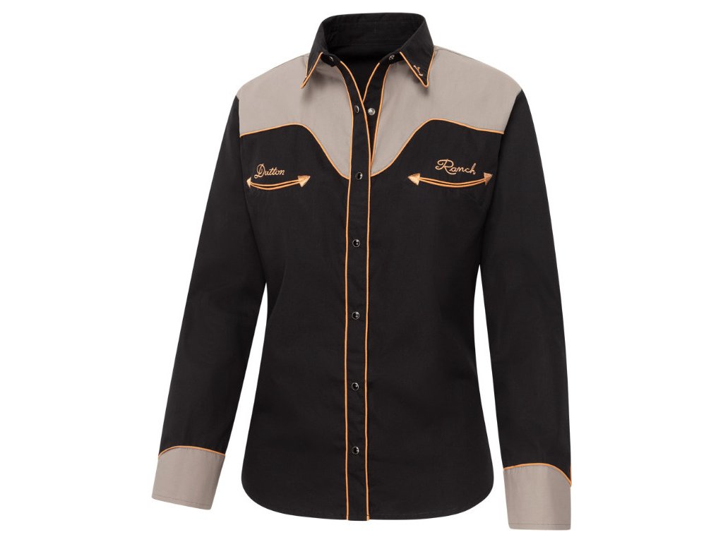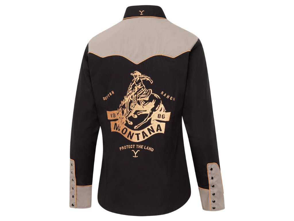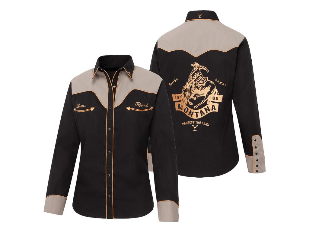 Dámska westernová košeľa Yellowstone s originálnou výšivkou na chrbte zaujme už na prvý pohľad. Kontrastný vrch košele je zvýraznený lemovaním vo farbe výšivky, ktoré podčiarkuje jej jedinečný charakter. Vykrojené vrecká a manžety so šiestimi gombíkmi odkazujú na klasický westernový štýl. Zdobená je oficiálnymi symbolmi Yellowstone a nápisom Dutton Ranch. Košeľa má moderný strih spájajúci eleganciu a pohodlie.