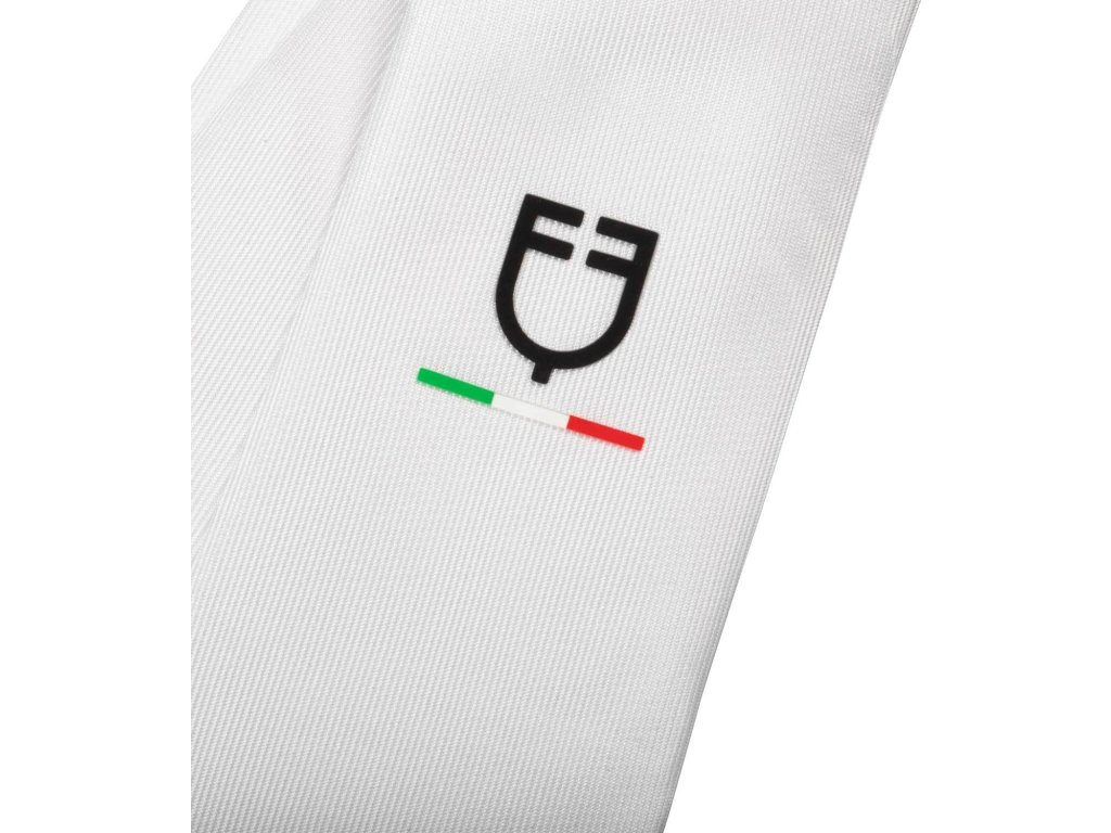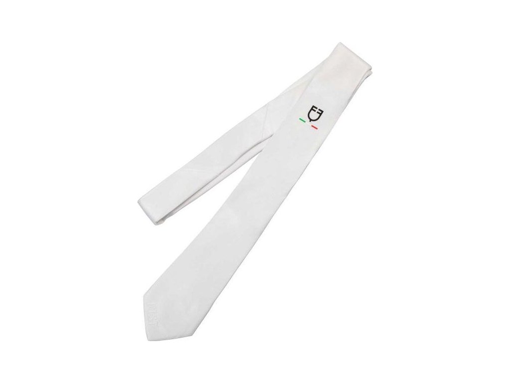 Kravata Equestro X Fise z klasickej bielej technickej tkaniny je nepostrádateľnou súčasťou súťažného outfitu. Uprostred je zdobená výšivkou loga Equestro a talianskej vlajky, ktoré jej dodávajú jedinečnú eleganciu a vycibrený vzhľad. Univerzálna veľkosť.