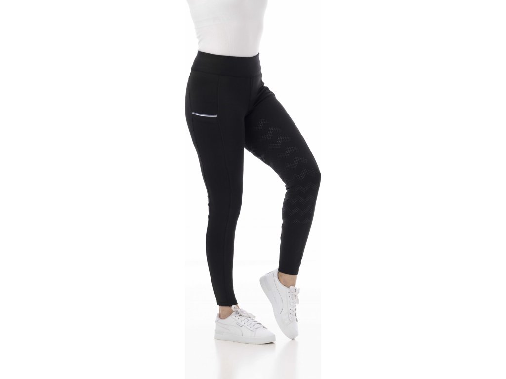 Tieto pohodlné jazdecké legíny sú vyrobené z elastickej a priedušnej tkaniny, ktorá zabezpečuje voľnosť pohybu aj v náročných podmienkach. Sú vybavené vysokým pásom a silikónovým gripom po celej dĺžke sedu. Grip zaisťuje maximálnu priľnavosť a bezpečnosť. Majú dve priestranné vrecká na stehnách s kontrastným lemovaním.