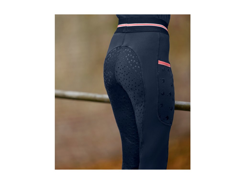 Zateplené jazdecké legíny s elastickým pásom, ktoré sú ideálne na prechodné obdobie. Vyrobené z hrejivého a priedušného materiálu. Sú vybavené protišmykovým silikónovým gripom pre väčšie pohodlie počas jazdy. Na pravom a ľavom stehne majú vrecko na mobilný telefón. Sú zdobené ružovou trblietavou páskou v páse a lemom okolo vreciek.