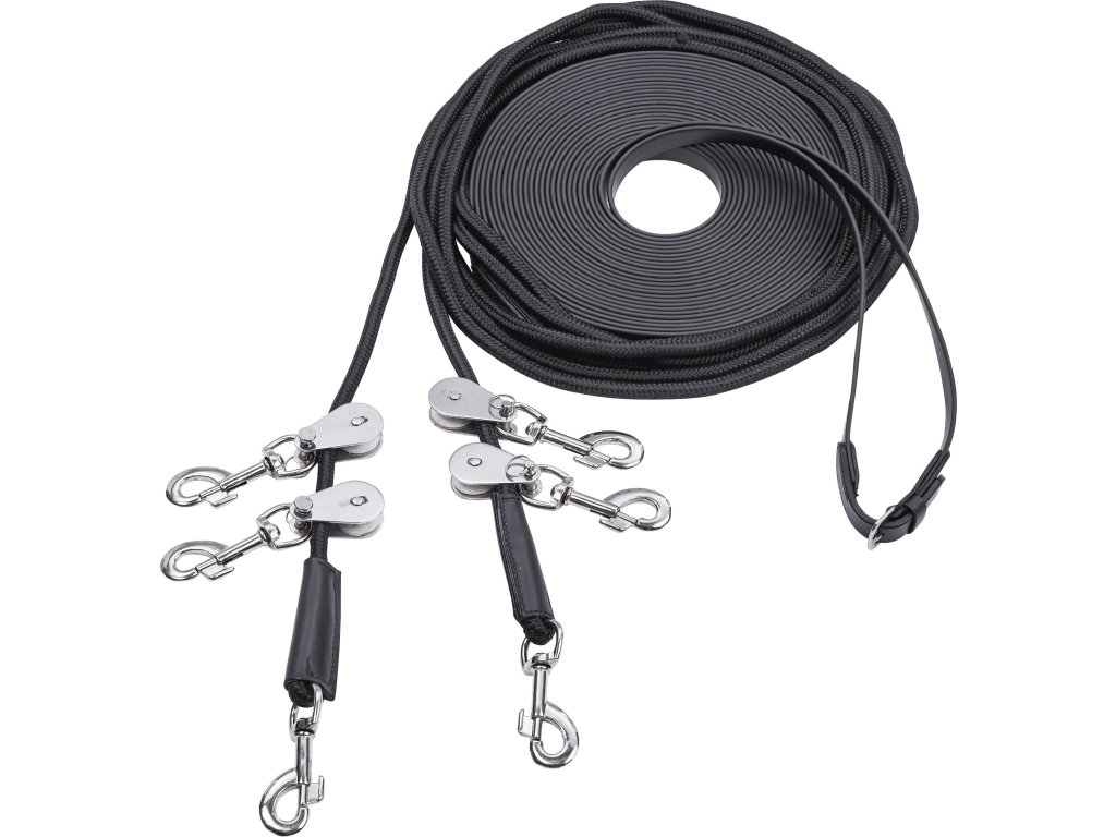 Dvojitá lonž Soft-Umlenkrollen BT zaujme mimoriadne mäkkým materiálom v kombinácii s vysokou odolnosťou. Povrchová úprava Biothane poskytuje istý a príjemný úchop, ktorý sa nešmýka ani za mokra. Materiál neabsorbuje vodu ani nečistoty, zostáva ľahký, flexibilný a tvarovo stály. Kvalitná povrchová úprava zároveň zaisťuje dlhú životnosť a vysokú odolnosť voči poveternostným vplyvom aj oderu, takže si lonž zachováva svoju kvalitu a vzhľad aj pri intenzívnom používaní. Konce z guľatého nylonového lana ľahko a bez odporu prekĺzavajú očkami na obrušníku, čo zaisťuje plynulú a neprerušovanú prácu. Praktické štyri otáčajúce sa kladky umožňujú bezproblémové vedenie oťaží aj pri dynamických zmenách smeru. Praktické otočné karabíny umožňujú rýchle a bezpečné pripnutie. Dĺžka 14 a 18 m.