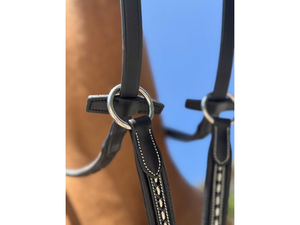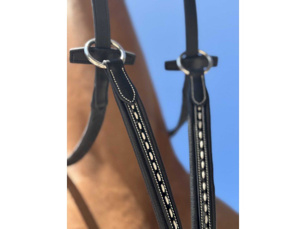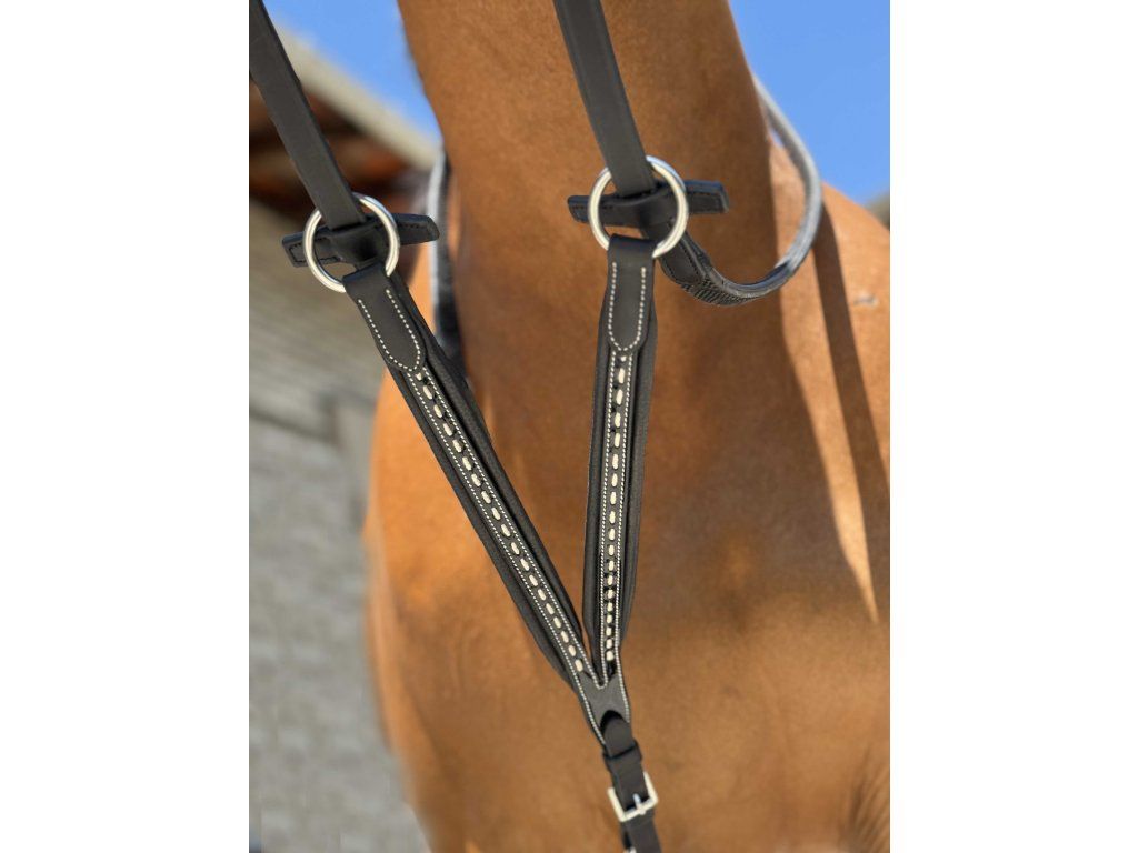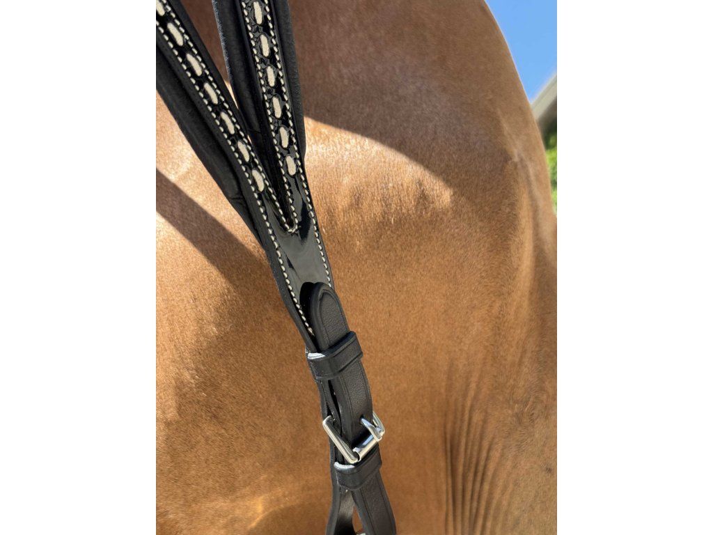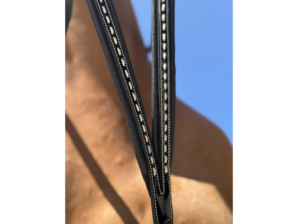 Veľmi elegantná kožená martingalová vidlica s lesklým povrchom a ozdobným kontrastným prešívaním vo vzore Point Sellier v bielej farbe. Na jednej strane sa upevňuje pomocou pracky, na druhej strane sa očká navliekajú priamo na oťaže.