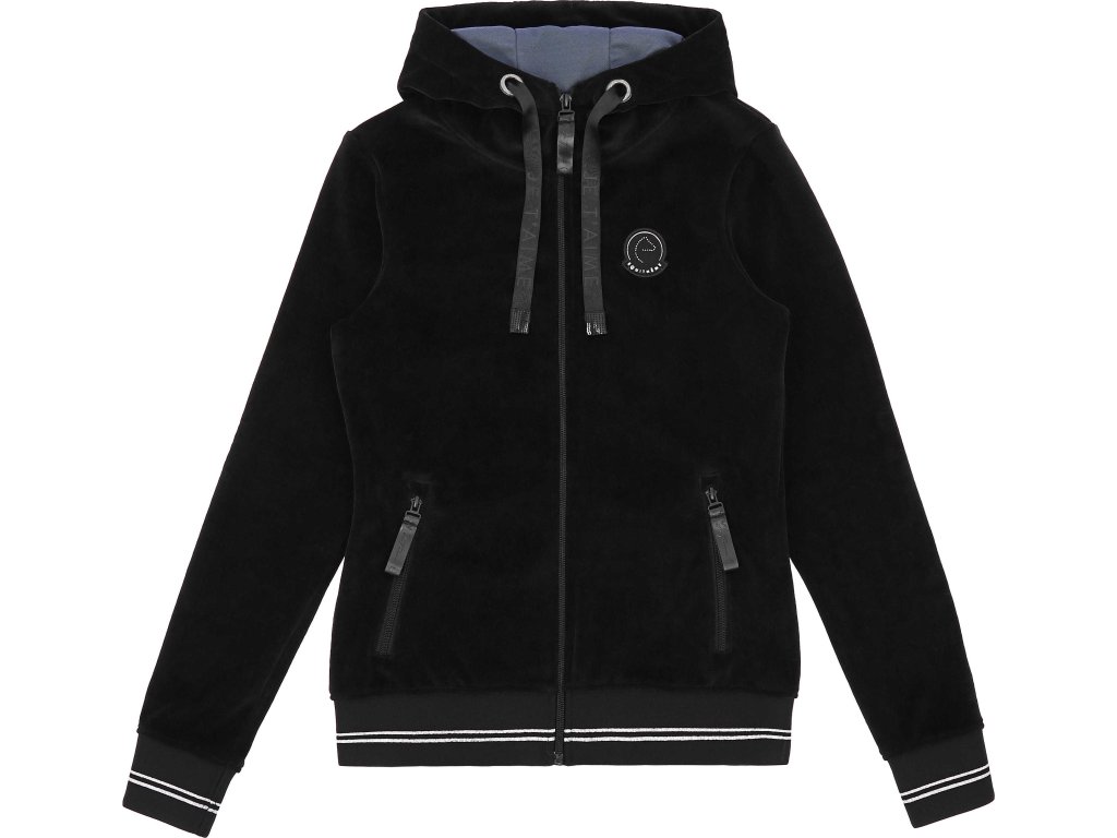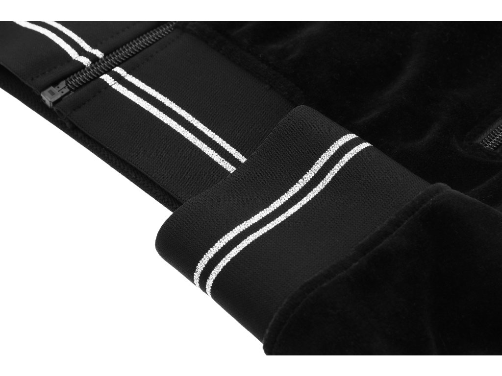 Semišová mikina so zapínaním na zips a prednými vreckami na zips. Priliehavý strih s elastickými manžetami zvýrazňuje siluetu a zaisťuje, že perfektne sadne. Kapucňa so sťahovacou šnúrkou chráni pred chladom. Zdobená detailmi v podobe elegantného odznaku na prednej strane a silikónového loga s kamienkami na chrbte.