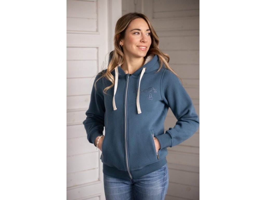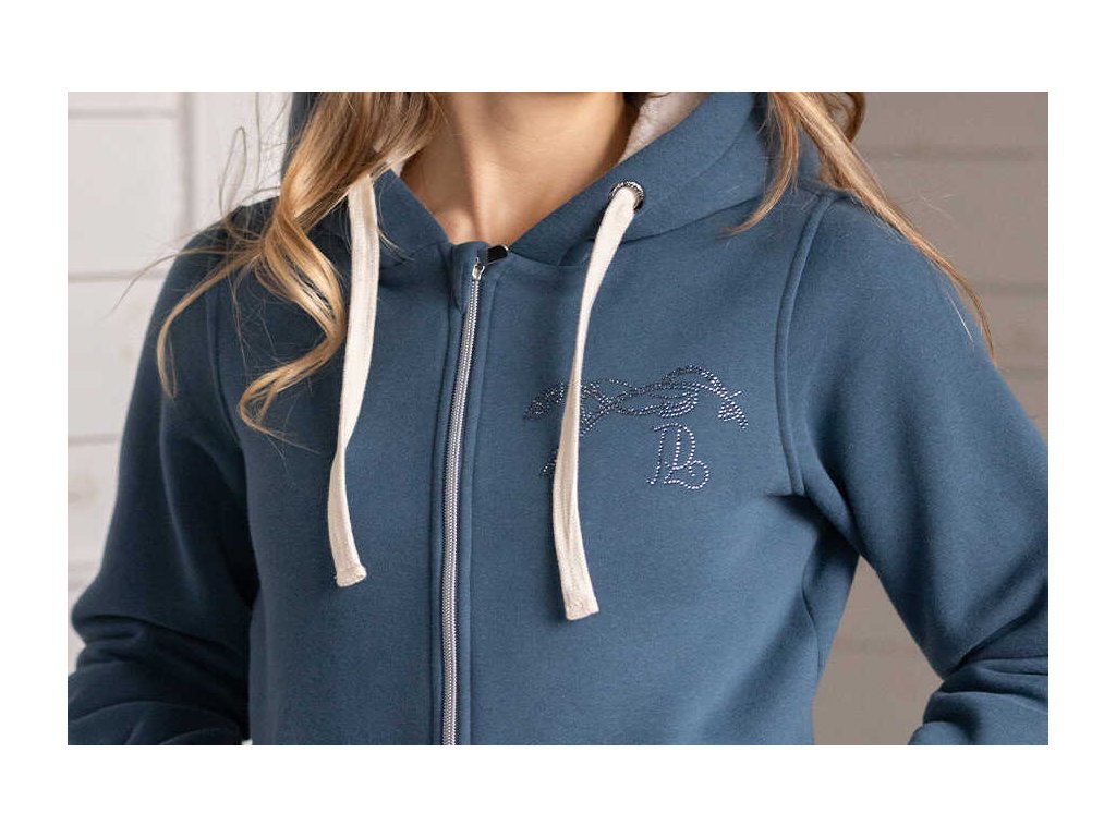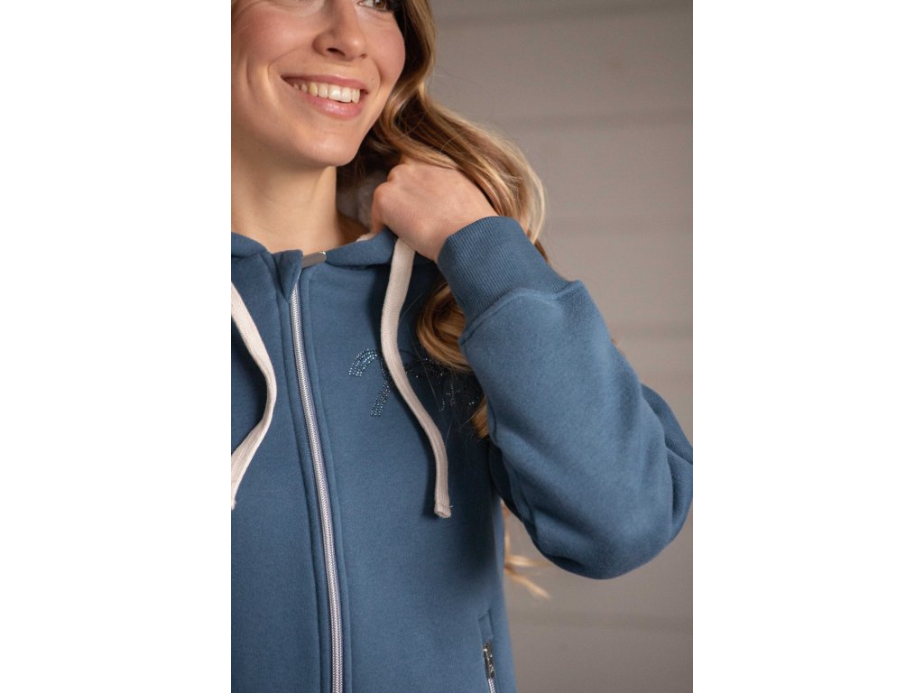 Dámská mikina Tressy je teplým kouskem se zapínáním na zip a kapucí. Velká kapuce je podšitá ultra jemným fleecem a je doplněna dvěma béžovými šňůrkami pro snadné nastavení. Vepředu má mikina dvě přední kapsy na zip a logo Penelope z kamínků. Je ideální pro nošení ve stáji i ve městě.