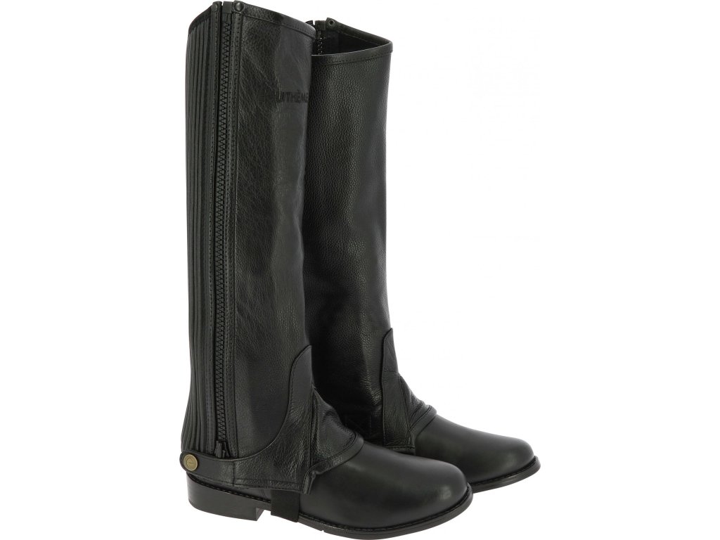 Jazdecké minichapsy vyrobené z granulovanej a veľmi mäkkej hovädzej kože. Kombinujú elegantný vzhľad s komfortom a odolnosťou. Lýtka a priehlavky sú vybavené elastickým materiálom, ktorý zaisťuje dokonalé prispôsobenie a pohodlie pri jazde. Praktický zadný zips je doplnený gombíkom pre bezpečné zapínanie bez otlačenia. Elastické kožené remienky pod chodidlom zabezpečujú stabilné usadenie.