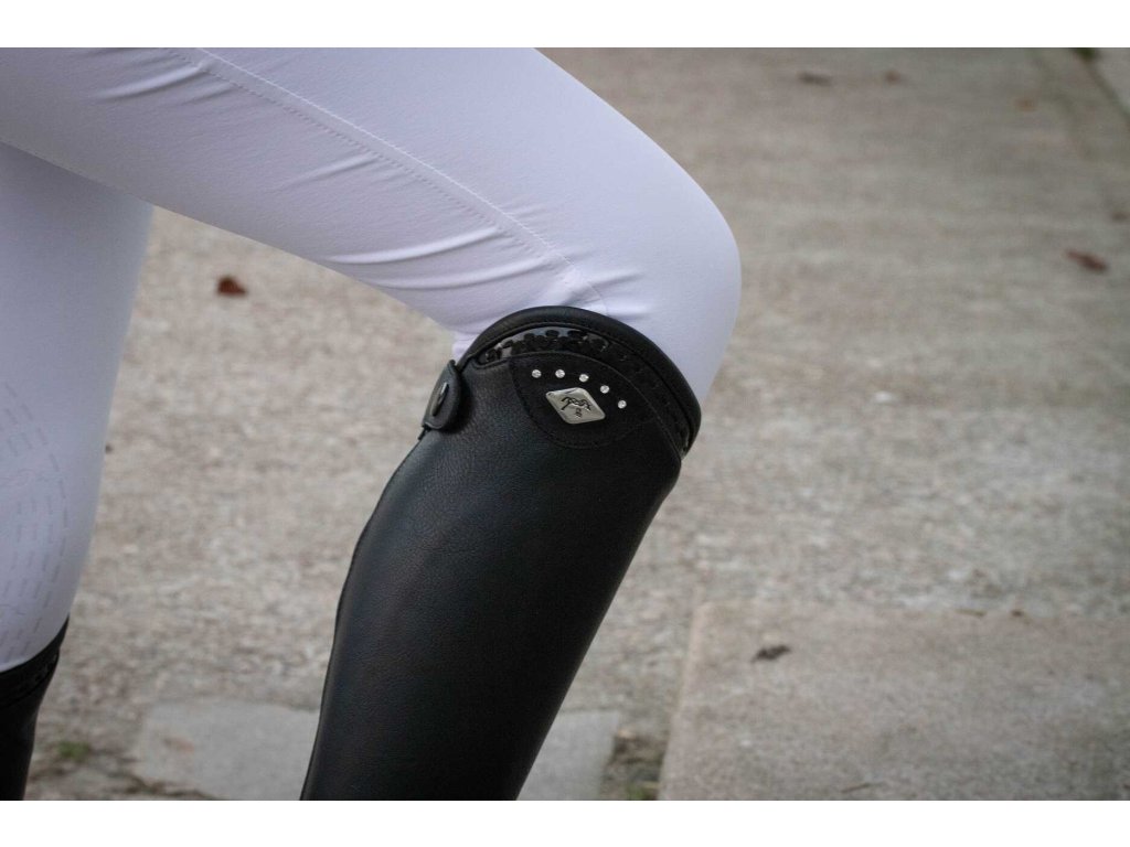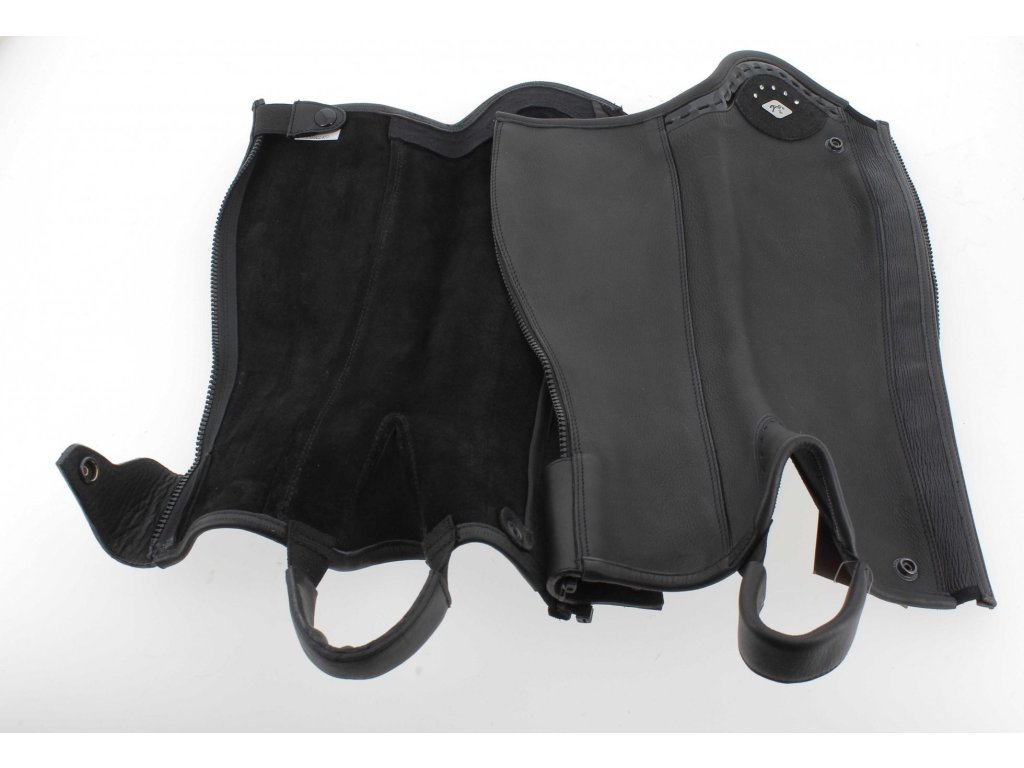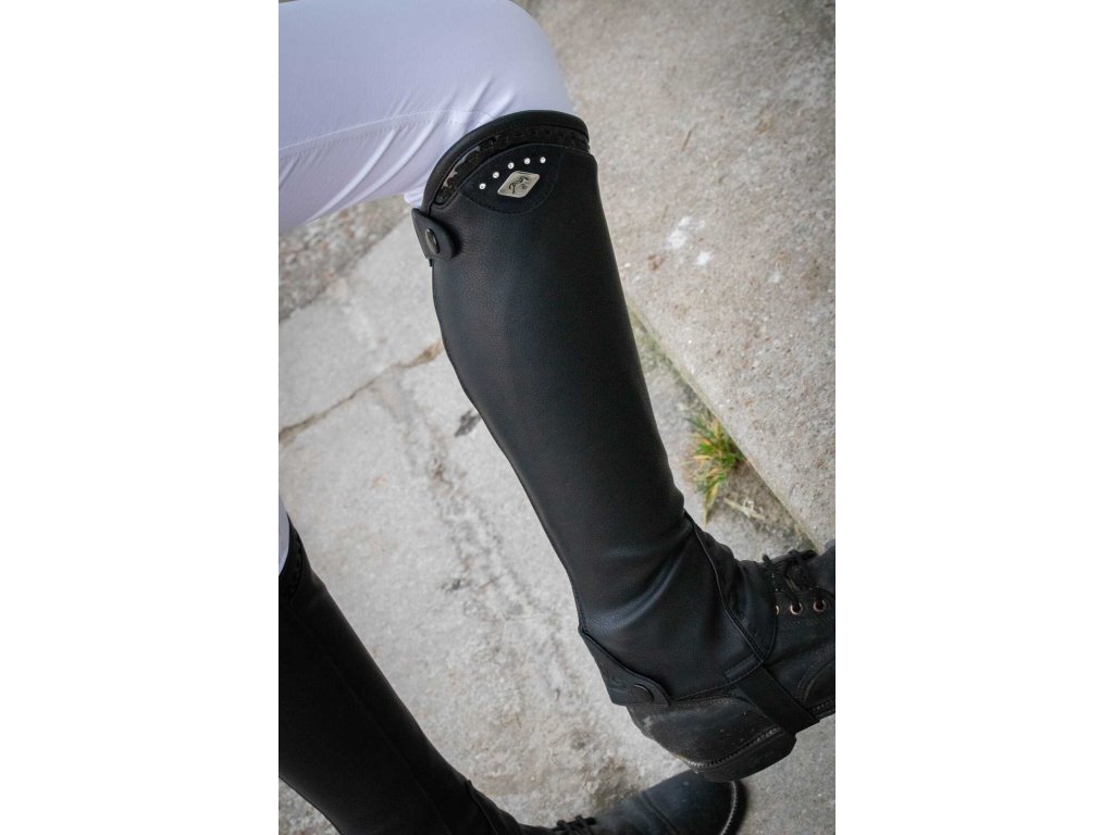 Detské minichapsy Softy skvele priliehajú vďaka veľmi tenkej syntetickej koži, ktorá krásne obopína lýtko. Zapínajú sa na zips, ktorý vedie zozadu od členku až nahor ku kolenu. Na spodnej časti vzadu je kožená krytka zipsu s monogramom výrobcu, ktorá chráni kone pred odrením. Na vonkajšej strane lýtka je strieborný diamantový detail s logom Penelope. Sú ideálne ako na rekreačné jazdenie, tak na preteky.
