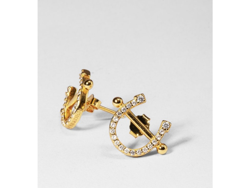 PS of Sweden X Byborn. Náušnice s podkovičkami zdobené trblietavými zirkónmi. Pozlátené 18-karátovým zlatom na jadre zo striebra 925. Logo PS of Sweden na boku. Dodávané v papierovej škatuli s logom. Rozmery: 15 mm x 12 mm.