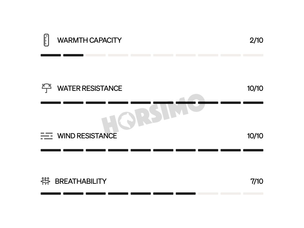 Vonkajší materiál: 100% polyester (trojvrstvový), spojený s poly trikotom a TPU membránou, vodný stĺpec 20 000 mm, priedušnosť 10 000 g/m²/24 h, Bionic Finish ECO (DWR úprava bez fluorokarbónov), certifikácia OEKO-TEX STANDARD 100