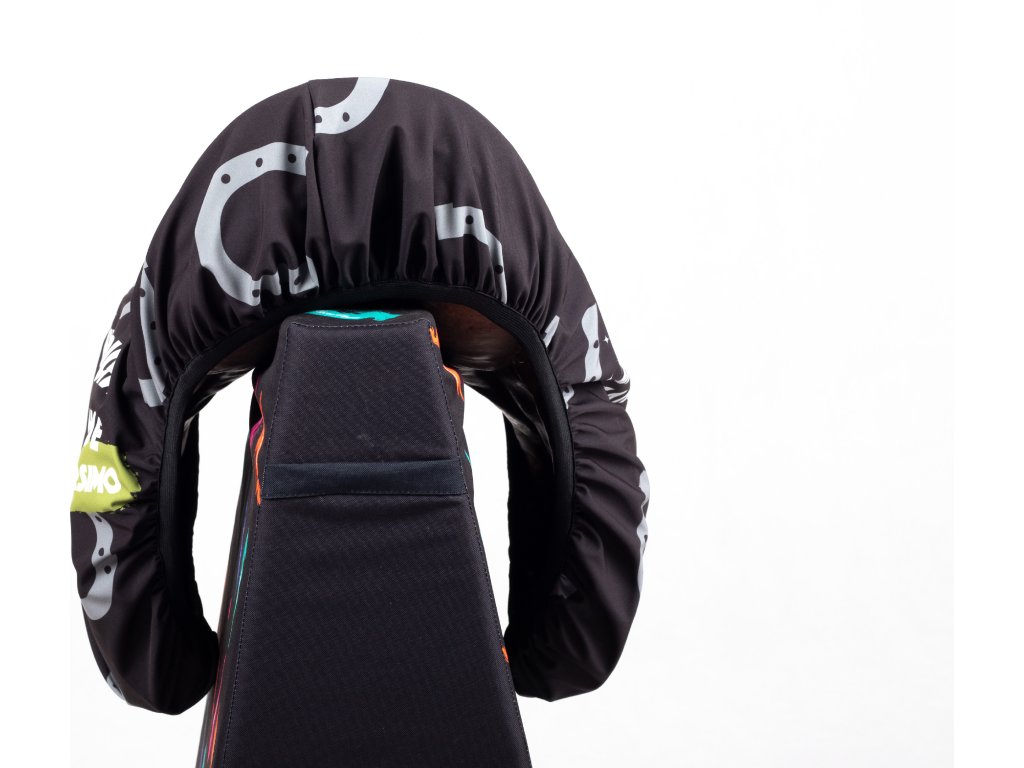 Štýlový obal na sedlo s logom HORSIMO je vyrobený z vodoodolnej softshellovej tkaniny s mäkkou fleecovou podšívkou. Spoľahlivo chráni sedlo pred prachom, poškriabaním a vlhkosťou. Vďaka pružnej gume po obvode sa ľahko prispôsobí takmer každému anglickému sedlu. Čierny dizajn s opakujúcim sa motívom dopĺňa výrazný nápis "Shine Bright Like a Horseshoe" a logo HORSIMO. Vyrába sa v univerzálnej veľkosti a je ideálny na každodenné použitie – ako pri skladovaní sedla v stajni, tak pri preprave. Upozornenie: Dizajny pre vás stále vylepšujeme, preto sa farby loga môžu líšiť od produktových fotografií.