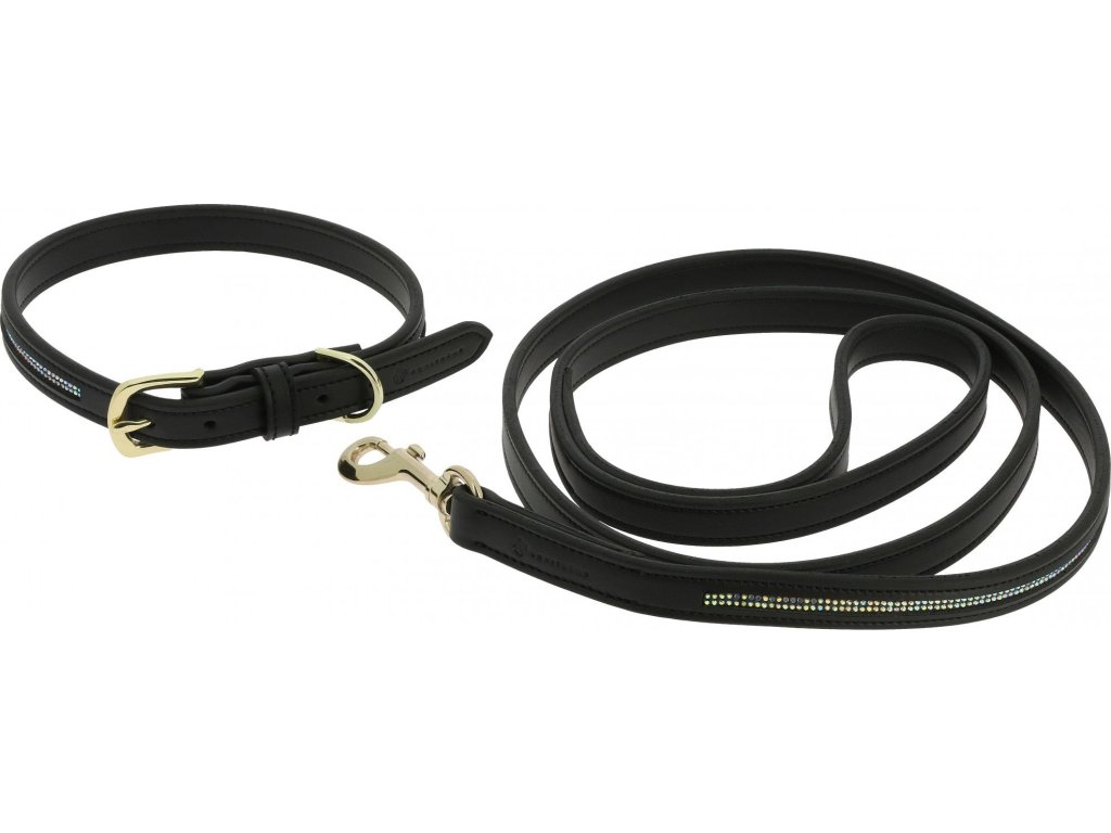 Elegantný obojok s vodítkom má kožený efekt, zdobený jemnými kamienkami a je doplnený zlatou karabínou, ktorá zaisťuje bezpečné a jednoduché pripnutie. Dostupný vo viacerých veľkostiach, šírka je 1,8 cm. Vodítko je dlhé 50 cm a široké 2 cm.
