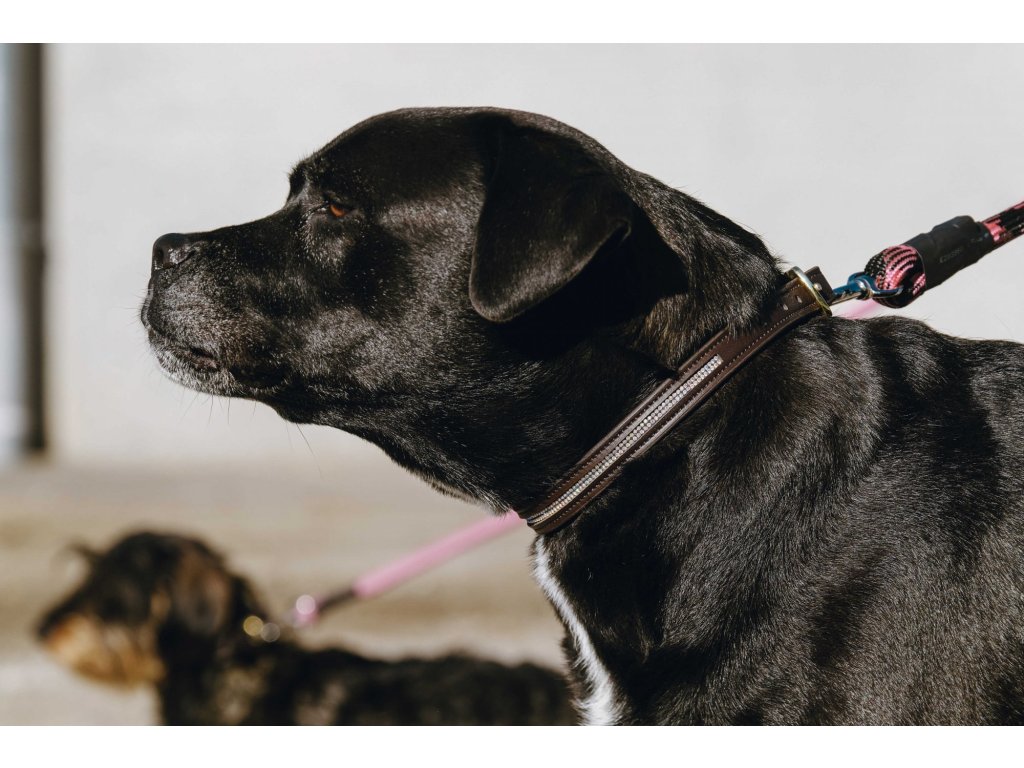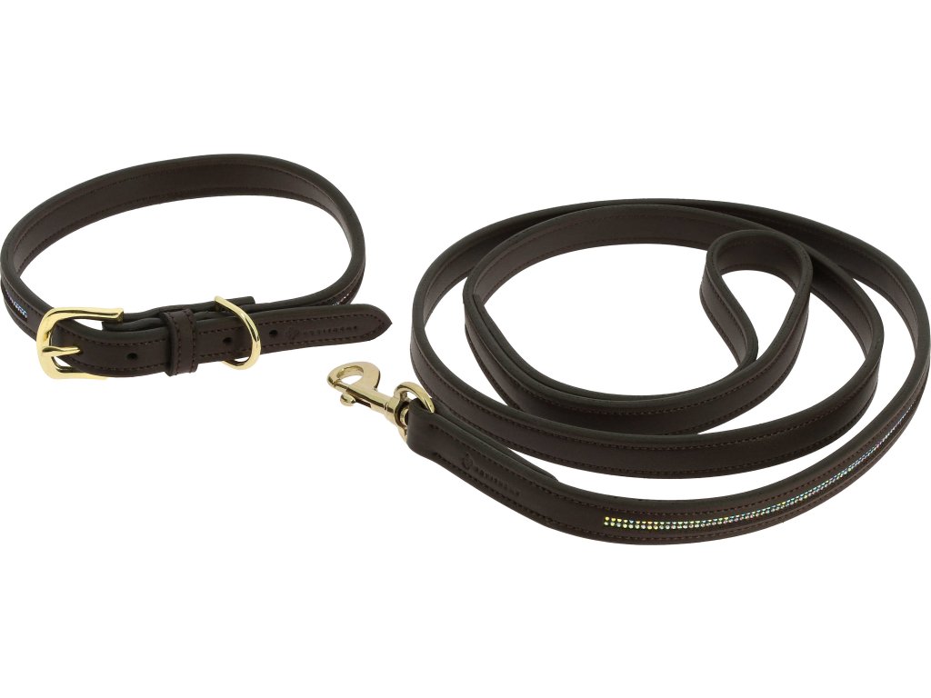 Elegantný obojok s vodítkom má kožený efekt, zdobený jemnými kamienkami a je doplnený zlatou karabínou, ktorá zaisťuje bezpečné a jednoduché pripnutie. Dostupný vo viacerých veľkostiach, šírka je 1,8 cm. Vodítko je dlhé 50 cm a široké 2 cm.