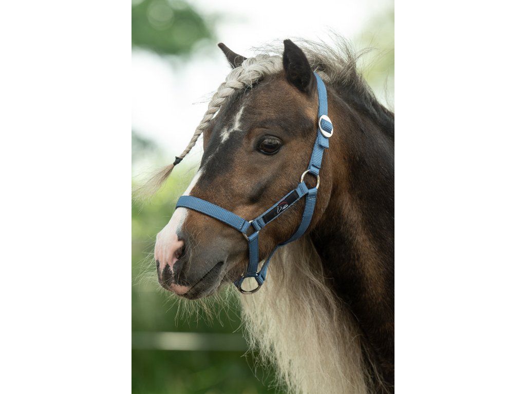 Nylonová ohlávka HKM špeciálne navrhnutá pre kone typu shetty. Veľkosť možno nastaviť podľa potreby pomocou posuvnej kovovej pracky. S kvalitným kovaním striebornej farby.