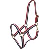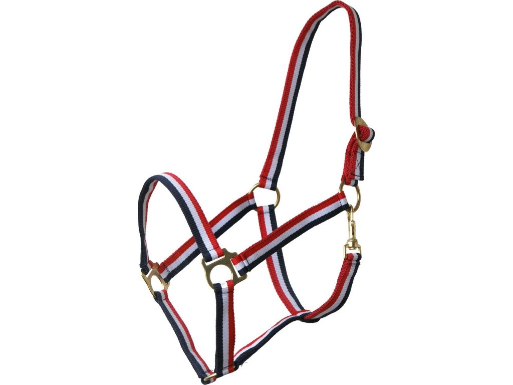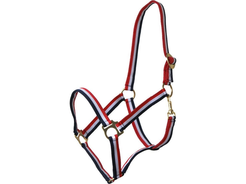 Pevná syntetická ohlávka s pruhovaným vzorom, ktorý sa hodí k niekoľkým svetovým vlajkám. Nastaviteľná pomocou posuvnej spony.