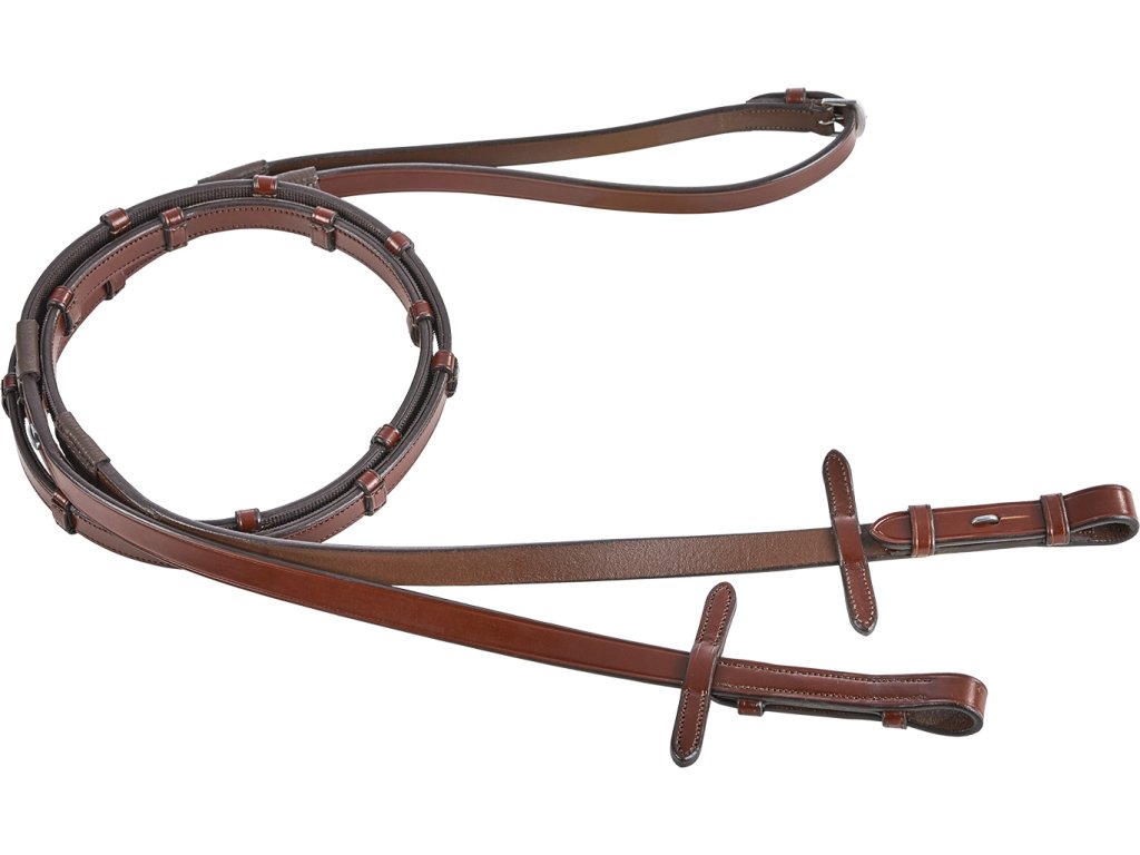 Funkčné oťaže s krásnym dizajnom z najlepšej talianskej kože. Oťaže sú vybavené gumovým profilom vnútri pre bezpečné držanie, zarážkami a úchytmi na martingal. Kovanie z nerezovej ocele. K dispozícii vo veľkosti 145 cm.