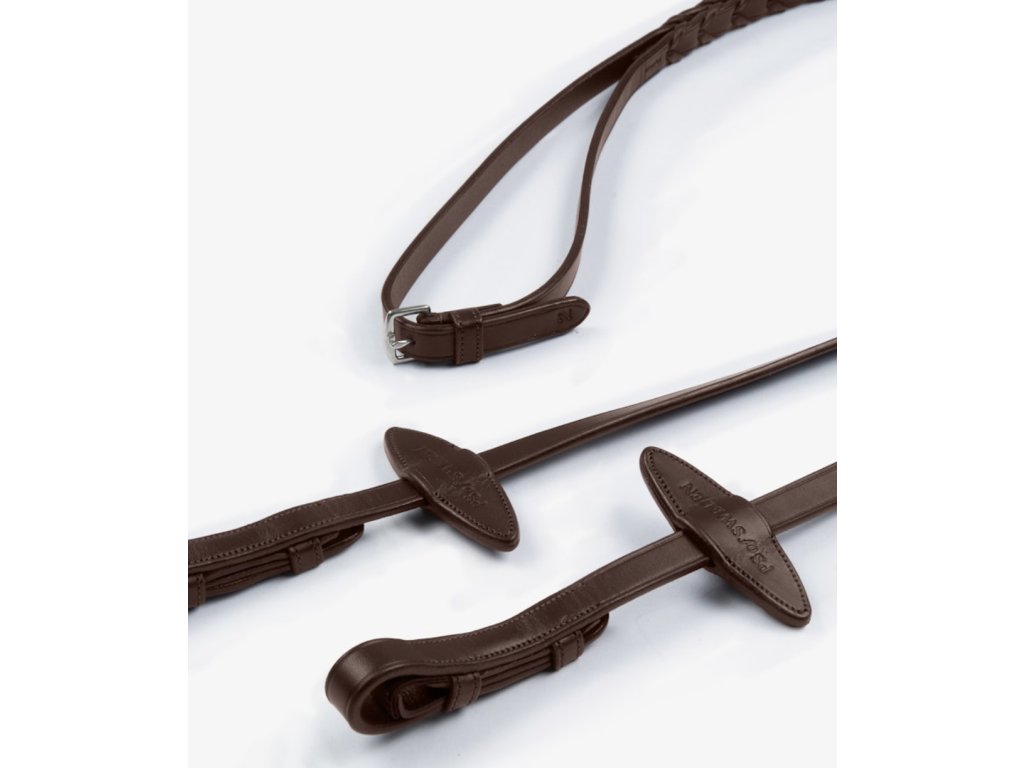 Štýlové kožené oťaže s prepletom. Vhodné na jazdecké hony. V strede majú pracku a v prípade potreby sa dajú odopnúť. Oťaže sú vybavené systémom Cradles™, ktorý poskytuje jemnejší kontakt medzi hubou a rukou jazdca. Systém Cradles™ sa dá od oťaží odopnúť. Vybavené strieborným kovaním. Vyrobené z talianskej kože.