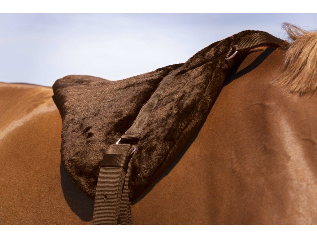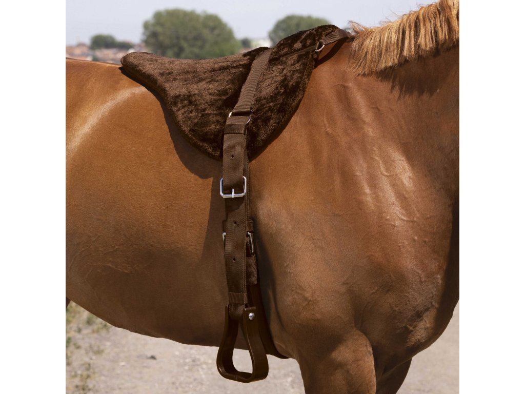 Objavte dokonalé pohodlie pre vás aj vášho koňa s týmto mäkkým a pružným jazdeckým padom navrhnutým na jazdu na holom chrbte (nie je potrebná podsedlová dečka). Vyrobený je z hebkej syntetickej kožušiny. Má 30mm penovú výplň pre maximálne pohodlie. Je vybavený nastaviteľnými strmeňovými remeňmi. Súčasťou sú aj westernové strmene, dlhý podbrušník s polypropylénovými pútkami a krátky polstrovaný podbrušník s dĺžkou 70 cm. Vďaka praktickým chrómovaným prackám je všetko ľahko nastaviteľné a pad sa dodáva v praktickej taške na zips. V oblasti prednej rázsochy vybavený praktickým pútkom.