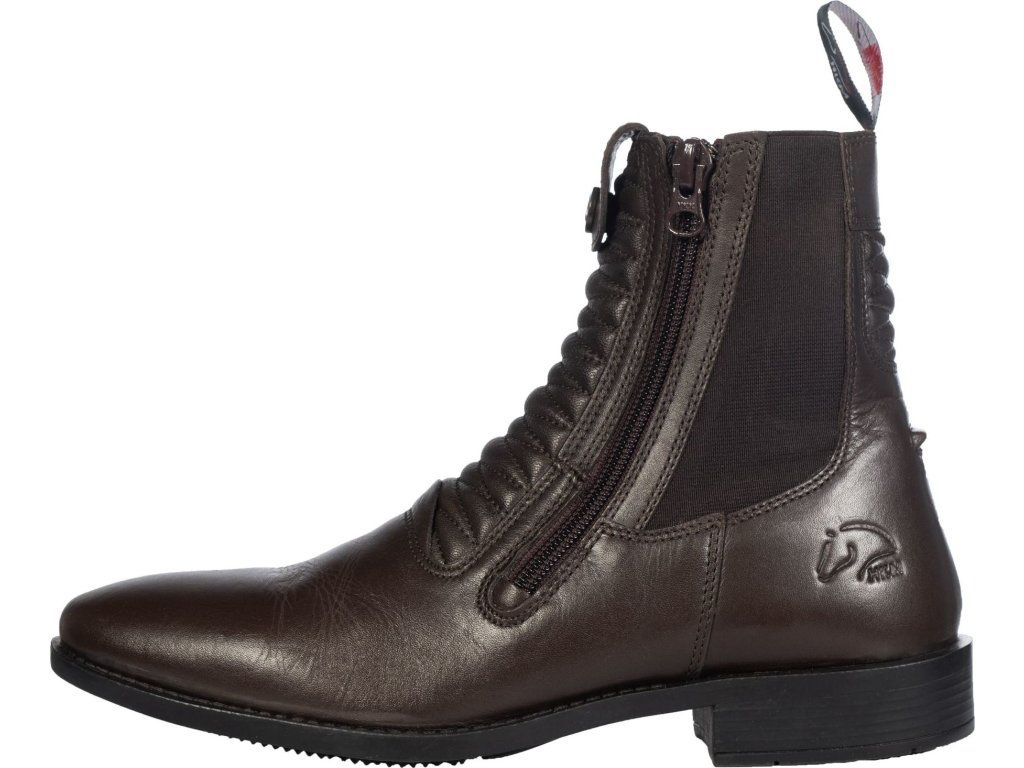 Vysokokvalitné jazdecké perka vyrobené z kože. Sú vybavené bočným zapínaním na zips. Ľahko sa obúvajú vďaka elastickým bočným vložkám a textilnému pútku v zadnej časti topánky. Vybavené zarážkami na šporne a syntetickou podrážkou. Je možné k nim dokúpiť skvele ladiace minichapsy Killarney HKM. K dispozícii v hnedej a čiernej farbe.