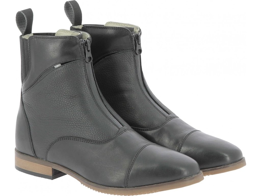 Kožené jazdecké čižmy Wavy sú elegantné a funkčné topánky z hovädzej kože, navrhnuté tak, aby sa prispôsobili takmer každému tvaru chodidla. Vďaka elastickému zakončeniu poskytujú vysoký komfort pri nosení a uľahčujú pohyb pri chôdzi aj v sedle. Zips YKK na prednej strane umožňuje rýchle a pohodlné obúvanie. Lesklé čierne detaily dodávajú topánkam moderný vzhľad a nechýba ani bočná zarážka na šporne. Protišmyková podrážka z materiálu Neolite a podpätky Masonite poskytujú stabilný a istý krok.