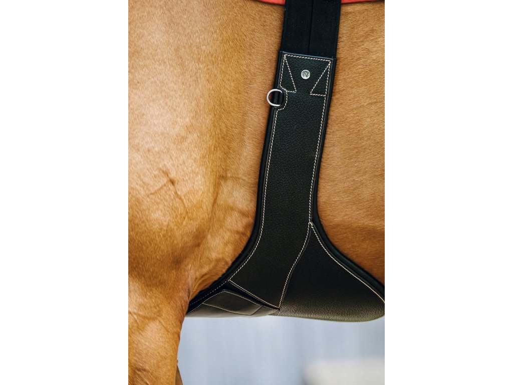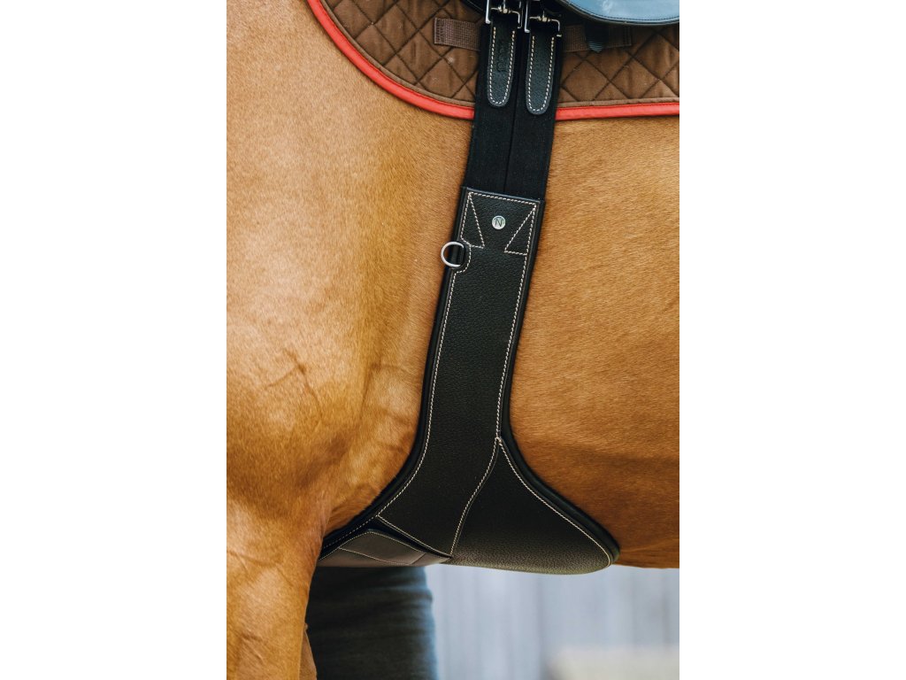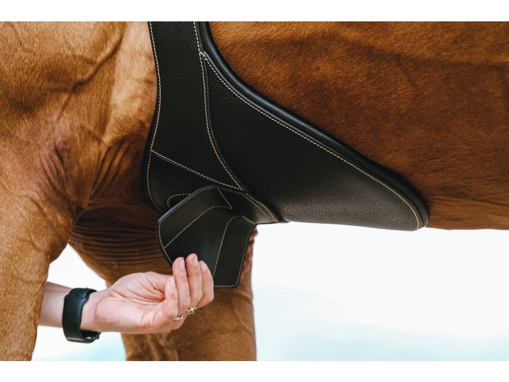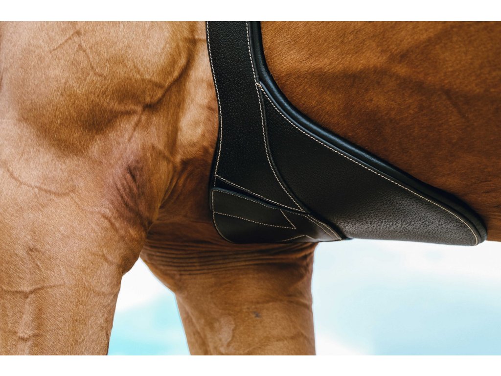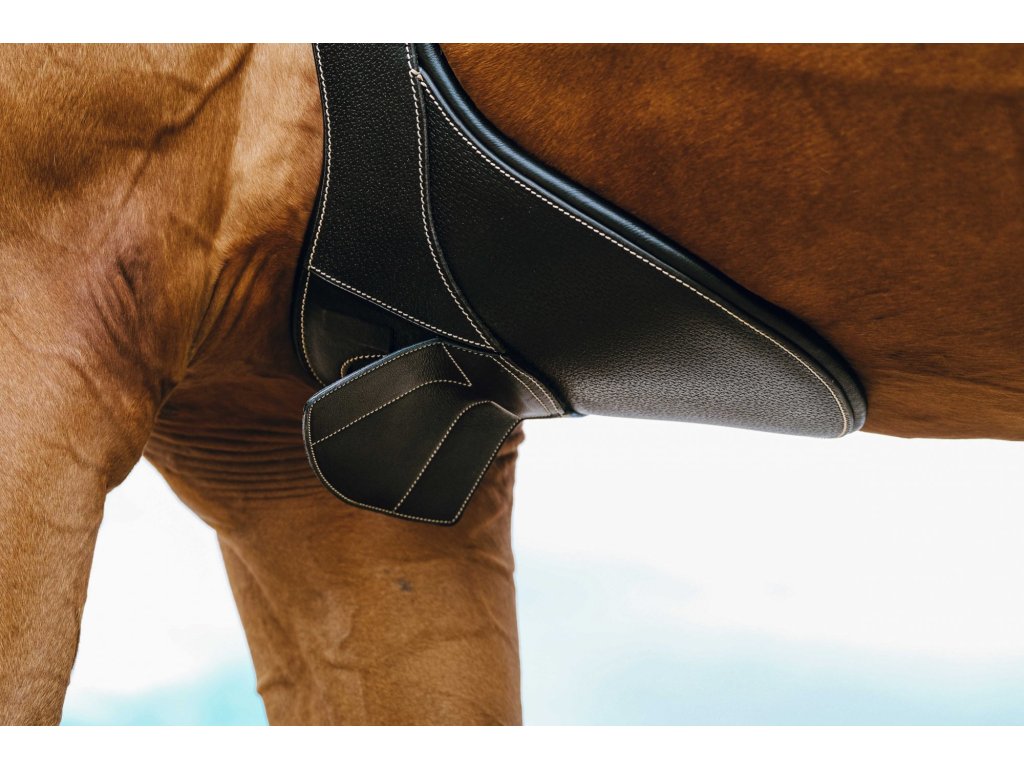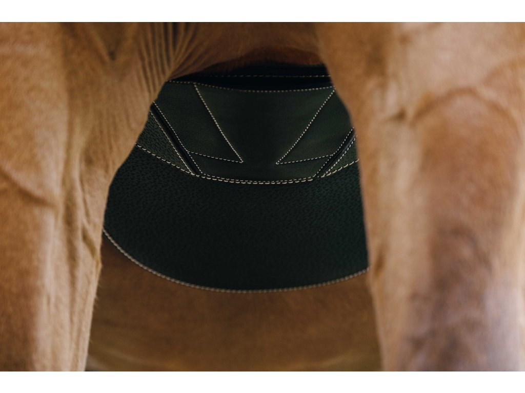 Okopávací podbrušník vyrobený zo zrnitej byvolej kože a podložený hovädzinou pre maximálne pohodlie. Stredová karabína je elegantne ukrytá pod magnetickou klapkou, na každej strane podbrušníka je jeden krúžok a konce sú vybavené elastickými doťahovacími gumami. Valčekové pracky z nerezovej ocele zaisťujú spoľahlivé a jednoduché zapínanie.