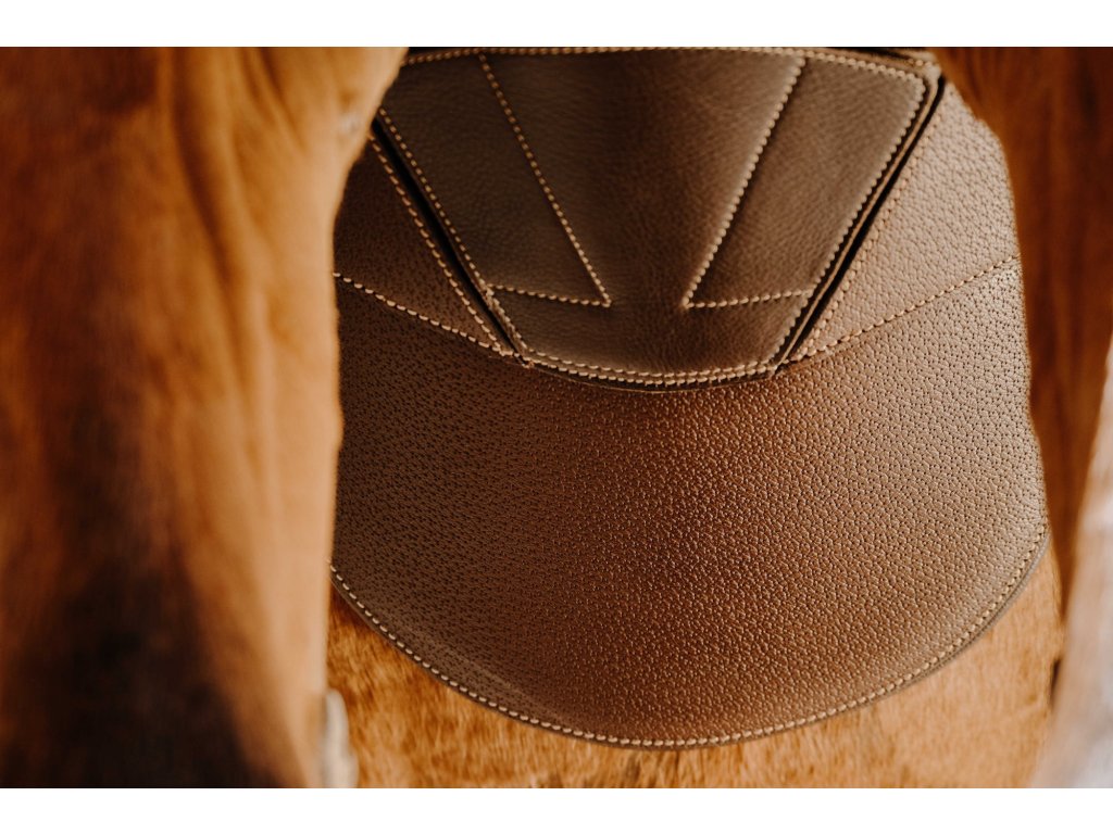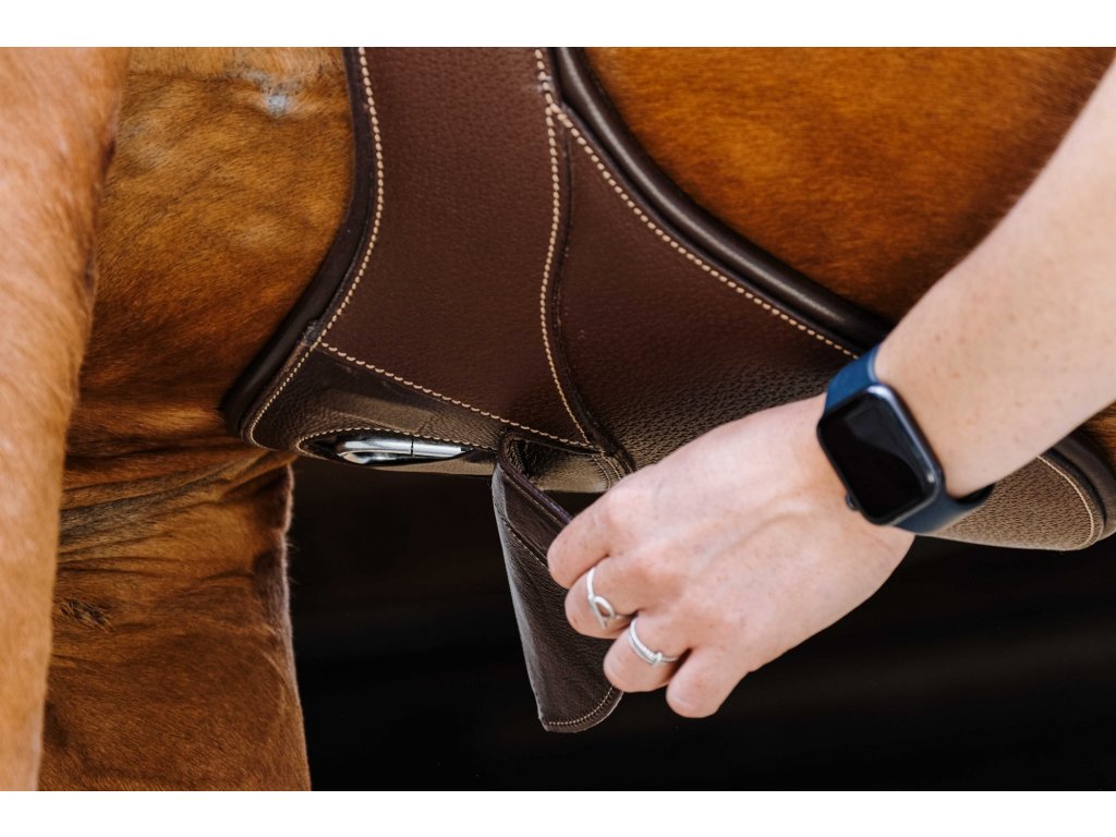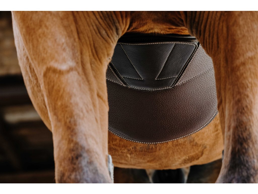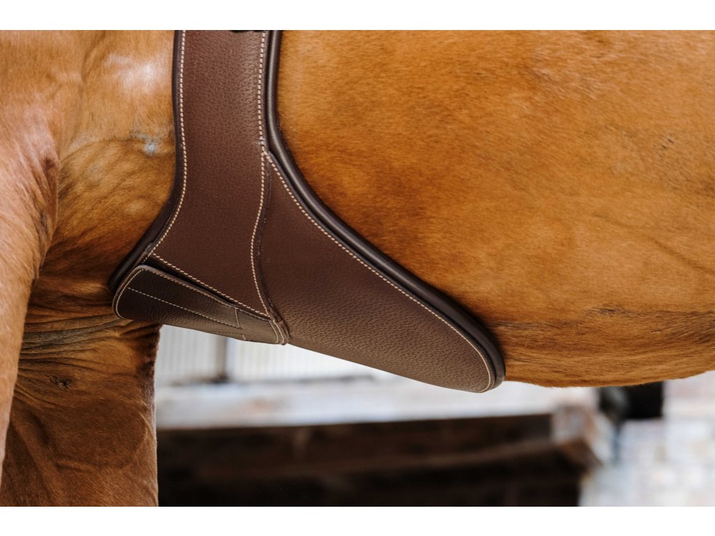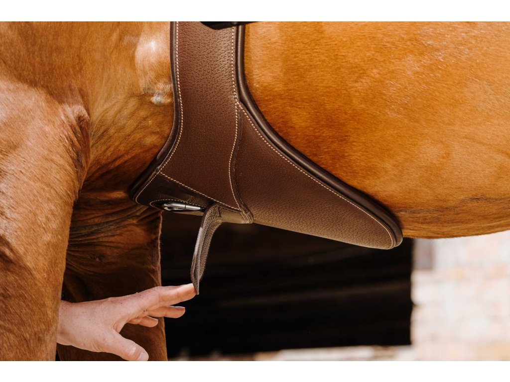 Okopávací podbrušník vyrobený zo zrnitej byvolej kože a podložený hovädzinou pre maximálne pohodlie. Stredová karabína je elegantne ukrytá pod magnetickou klapkou, na každej strane podbrušníka je jeden krúžok a konce sú vybavené elastickými doťahovacími gumami. Valčekové pracky z nerezovej ocele zaisťujú spoľahlivé a jednoduché zapínanie.