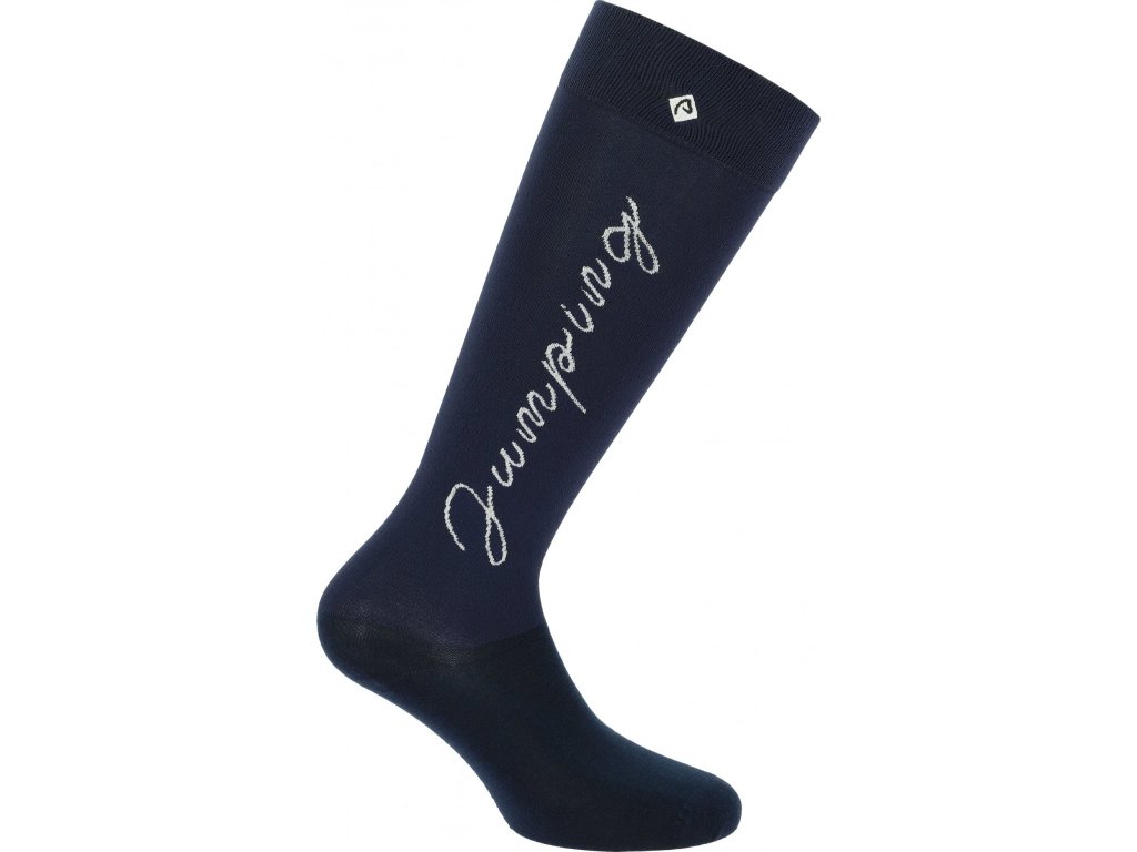 Kvalitné jazdecké podkolienky v tmavomodrej farbe zaujmú výrazným strieborným písaným nápisom Jumping, ktorý sa tiahne po celej dĺžke. Sú vyrobené z príjemného materiálu s vysokým podielom bavlny, ktorý zaisťuje pohodlie a priedušnosť. Polyamid pridáva odolnosť a elastan sa postará o pružnosť a perfektné priľnutie k nohe. Podkolienky skvele sadnú do jazdeckých topánok a držia svoj tvar aj pri celodennom nosení.