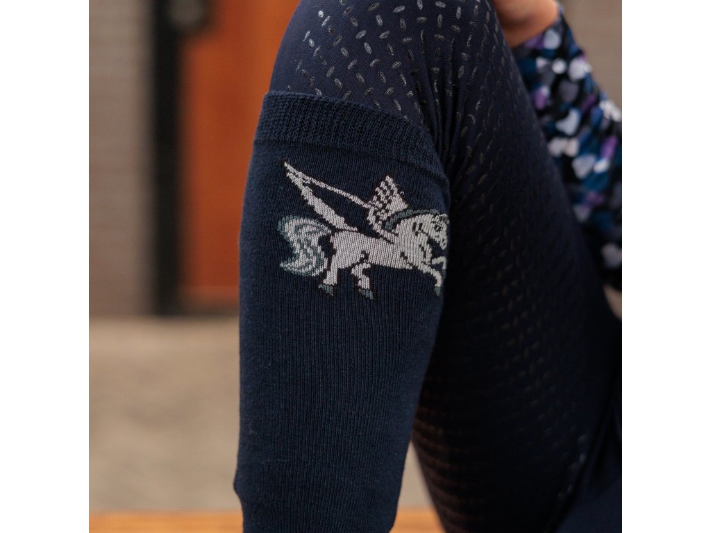 Podkolenky, které kombinují vysoký komfort, odolnost a hravý jezdecký styl. Mají vysoký střih pro pohodlné nošení v jezdeckých botách a měkký bavlněný materiál v oblasti chodidla, který zajišťuje prodyšnost a příjemný pocit po celý den. Odolný materiál je přizpůsoben nárokům aktivního jezdeckého života. Ilustrace pegase dodává podkolenkám originální vzhled.