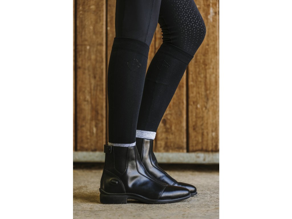 Elegantné jazdecké podkolienky Equithème v klasickej čiernej farbe s jemným logom z trblietavých kamienkov. Vyrobené z mimoriadne tenkého a priedušného materiálu, ideálneho na letné mesiace. Možno ich prať v práčke na 30 °C na jemnom programe a sušenie v sušičke sa neodporúča.