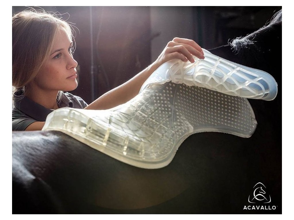 Zadný riser (vyvýšená tlmiaca gélová korekčná podložka) vďaka voštinovej štruktúre absorbuje a rovnomerne rozkladá hmotnosť jazdca. Znižuje tlakové body a zlepšuje priľnavosť a pohodlie. Pomáha udržať lepší kontakt so sedlom, ak váš kôň upadol na svaloch, protišmyková. Umožňuje cirkuláciu vzduchu, usadzuje sedlo do správnej pozície, pružný gél sa prispôsobuje pohybom koňa. Vhodná kompenzácia nesediaceho sedla. Dečka sa vyrába v jednej veľkosti. Možno ju prípadne zastrihnúť podľa potreby.