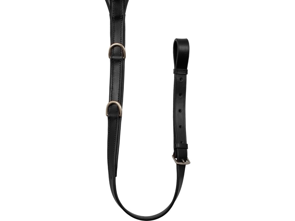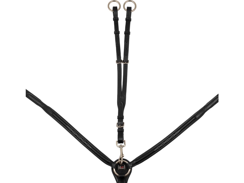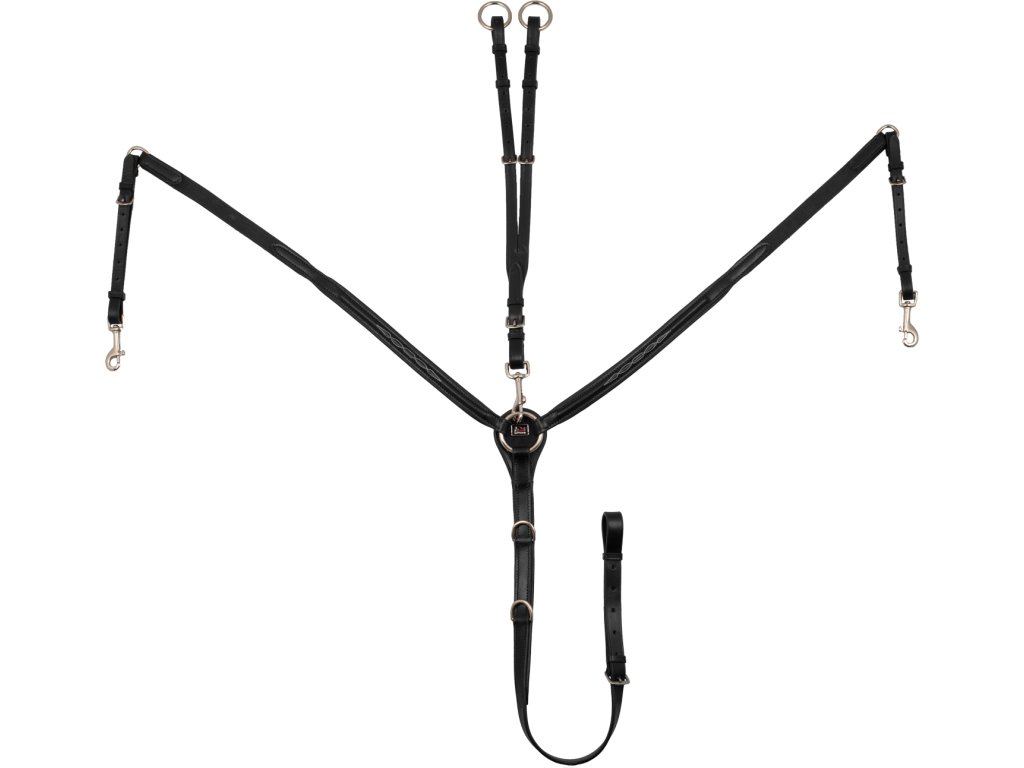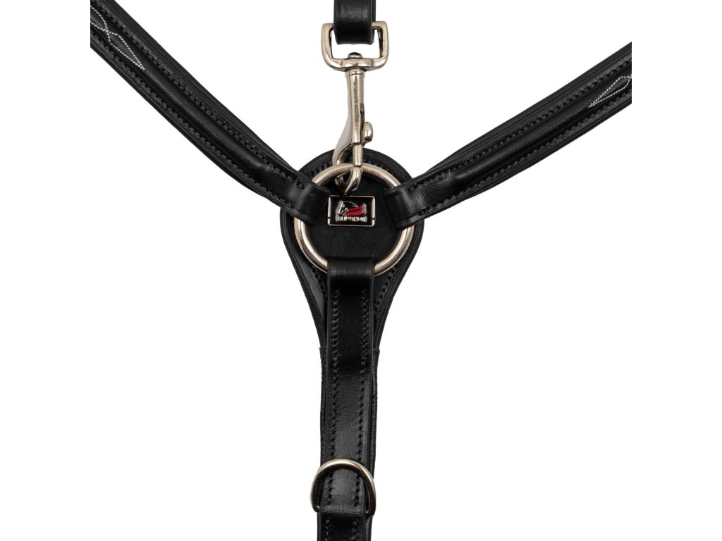 Kvalitný trojbodový poprsník z teľacej kože. Vybavený odnímateľnou martingalovou vidlicou. Drží sedlo v správnej polohe a zabraňuje posunu do bedrovej oblasti. Vybavený kovaním z nerezovej ocele. Elastické kovanie poskytuje maximálne pohodlie. Zdobený kontrastným prešívaním. K dispozícii aj v hnedej farbe. K dispozícii vo veľkostiach Pony, Cob a Full.