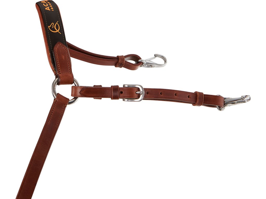 Luxusný poprsník z talianskej teľacej kože, upevnenie na sedlo, karabíny z nerezovej ocele prémiovej kvality, nastaviteľné remene, elastické vložky z extra odolných vlákien, odnímateľný martingal. Kolekcia ACAVALLO Leather Passion. K dispozícii aj v čiernej a tmavohnedej farbe. Vyrába sa vo veľkostiach COB a FULL.