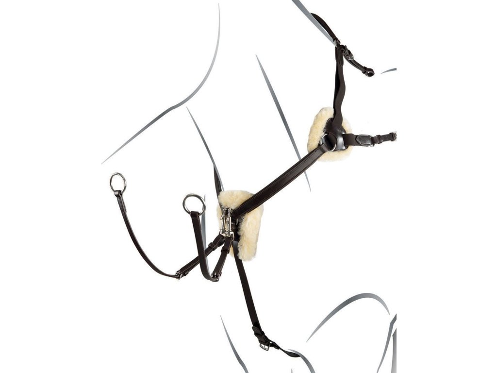 Špičkový päťbodový poprsník vyrobený z veľmi kvalitnej kože. Poprsník je plne nastaviteľný a je vybavený odnímateľnou martingalovou vidlicou. Vybavený odnímateľnými barančekmi z pravej vlny na ramenách a hrudi, ktoré sa dajú dokúpiť aj samostatne. Elastické popruhy poskytujú väčšiu voľnosť pohybu a pohodlie koňa. Vybavený kovaním z nerezovej ocele. Dostupný je tiež v tmavohnedej farbe. Veľkosti PONY, COB a FULL.