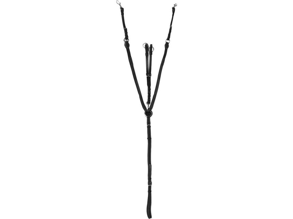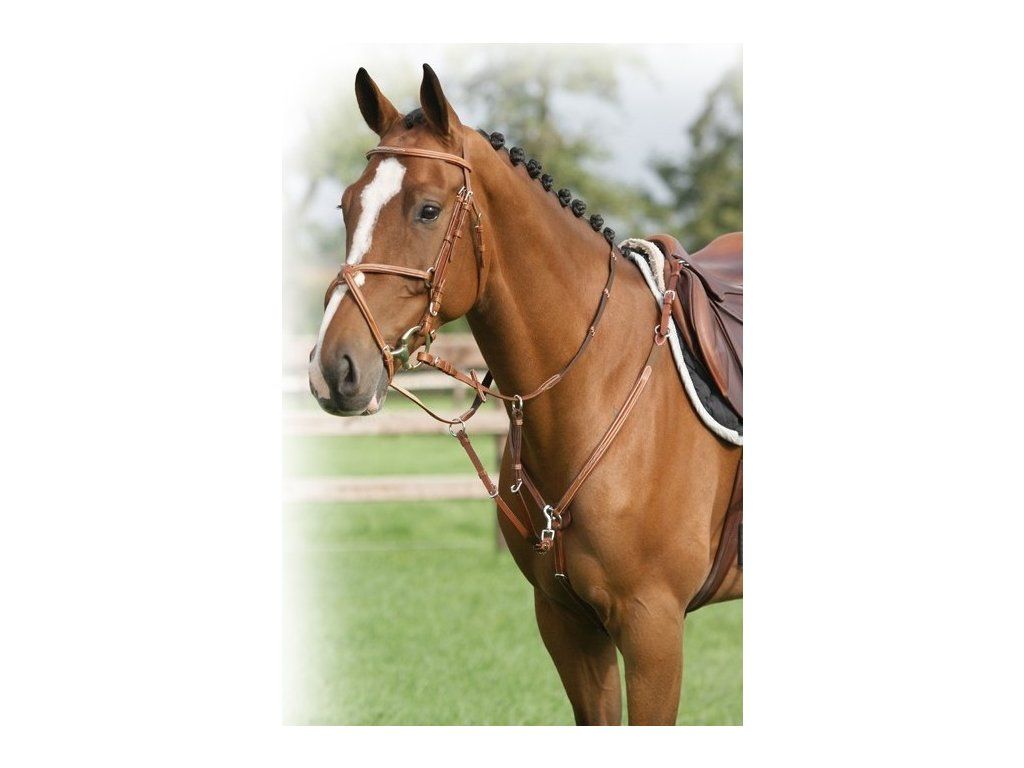 Luxusný bielo prešívaný poprsník s martingalovými vidlicami. Nastaviteľný na šiestich miestach, s karabínami na pripevnenie k sedlu. K dispozícii v tmavohnedom a čiernom prevedení.