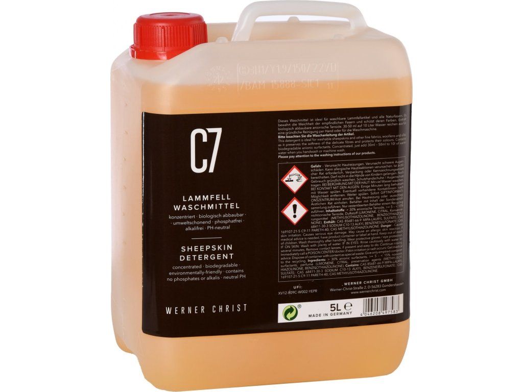Čistiaci prostriedok na jahňaciu kožu. Ekologicky šetrný a vysoko účinný koncentrát špeciálne vyvinutý pre optimálnu starostlivosť o produkty Werner Christ Horse. Je vhodný na pranie jahňacej kože aj výrobkov, ktoré ju obsahujú. Prípravok C7 zachováva prirodzenú mäkkosť jemných vlákien, chráni farby a predlžuje životnosť kože. UPOZORNENIE: Pre zachovanie pružnosti kože odporúčame pridať bežné zmäkčovadlo. Bežné pracie prostriedky na textil či vlnu nie sú vhodné na pranie výrobkov z jahňacej kože.