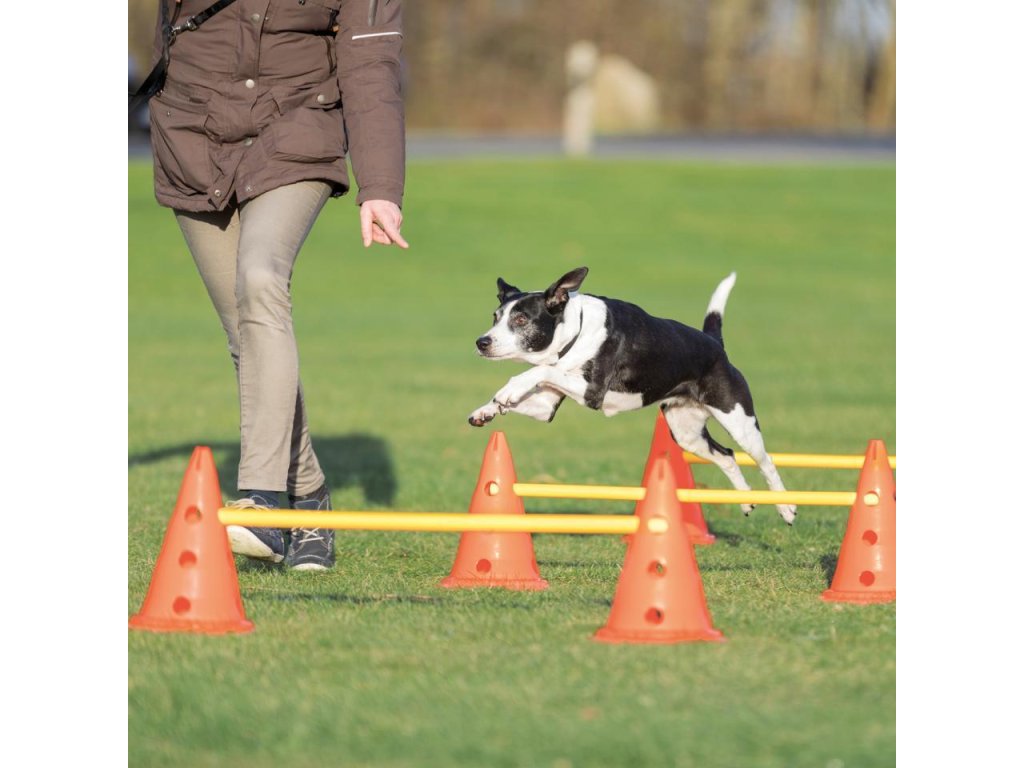 Tento prekážkový set je vynikajúcim nástrojom na zvýšenie koncentrácie a koordinácie u psov. Vhodný je aj na fyzioterapeutickú liečbu, pretože pomáha zlepšiť svalovú rovnováhu a pohybové vzorce. Vďaka rôznym možnostiam zostavenia prekážok alebo slalomových dráh sa dá tréning ľahko prispôsobiť konkrétnym potrebám a schopnostiam psa. Variabilné nastavenie výšky umožňuje použitie prekážok pre psov všetkých vekových kategórií a veľkostí. Tyče sú vyrobené z ľahkého plastu v oranžovej farbe, ktorá je dobre viditeľná. Tieto prekážky podporujú rozvoj agility, poslušnosti a fyzickej kondície. V balení je 6 kužeľov a 3 tyče. Predávajú sa v 2 veľkostných variantoch - rozmery kužeľov: 23x30 cm, dĺžka tyče: 78 cm a rozmery kužeľov 30x50 cm, dĺžka tyče: 100 cm.