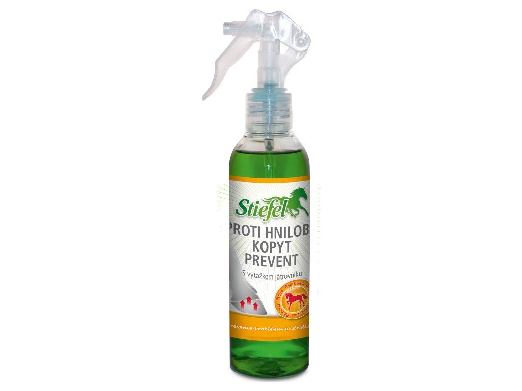 Stiefel Proti hnilobe kopýt prevent sa stará o strelku, chodidlo a bielu čiaru a pomáha ich regenerácii. Starostlivo vybrané zloženie účinných látok podporuje regeneráciu prasklín a poškodených miest. Vďaka vysokému obsahu látok zadržujúcich vlhkosť, provitamínu B5 a levanduľového oleja dostáva kopyto všetko, čo potrebuje na zdravú a rýchlu regeneráciu a tvorbu kvalitnej kopytnej rohoviny. Pečeňovka obsiahnutá v tomto výrobku pomáha kopytnej rohovine brániť sa proti škodlivým látkam z vonkajšieho prostredia.Stiefel Proti hnilobe kopýt sa veľmi ľahko nastrieka pomocou rozprašovača na strelku a chodidlo. Vďaka aplikátoru v spreji sa látka dostane na potrebné miesta a ochráni aj ťažko dostupné časti.