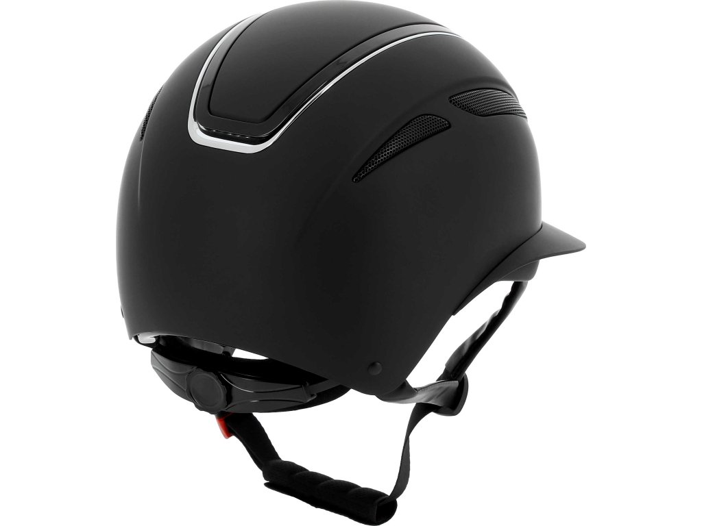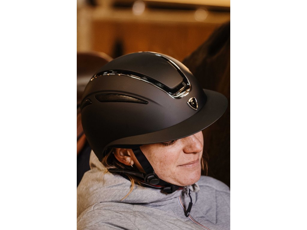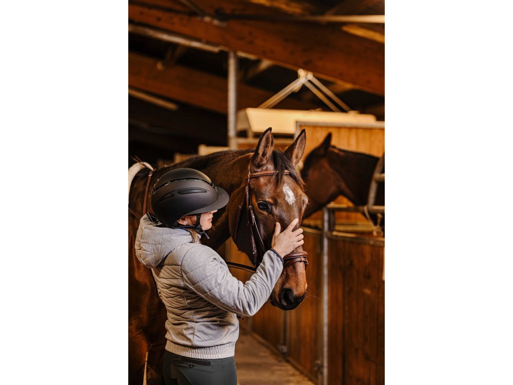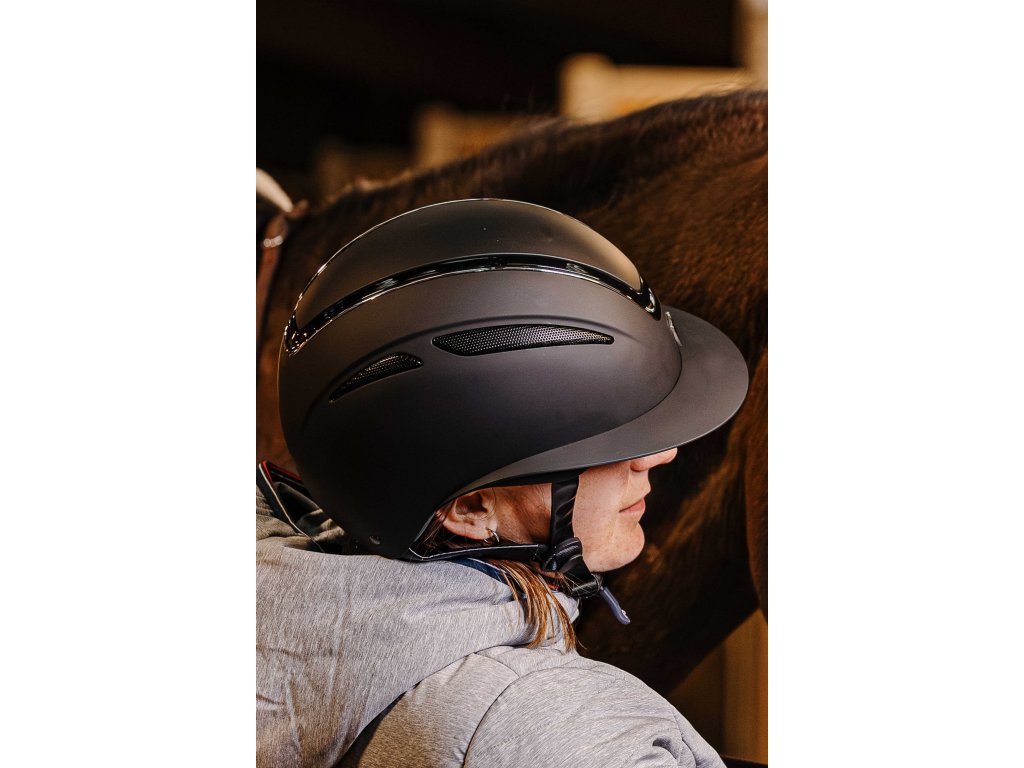 Elegantná a pohodlná jazdecká prilba so širokým šiltom, ktorá spája štýl, bezpečnosť a maximálny komfort. Vďaka matnému povrchu pôsobí moderne a sofistikovane. EPS škrupina s vysokou hustotou zaisťuje ľahkosť a skvelú absorpciu nárazov. Vnútri nájdete vložku, ktorá efektívne odvádza vlhkosť, je odnímateľná a možno ju prať. Prilba ponúka optimálnu ventiláciu vďaka otvorom v prednej, zadnej, bočnej aj strednej časti. Pre dokonalé prispôsobenie slúži sťahovacie koliesko na zadnej strane, zatiaľ čo remienok s rýchloupínacou prackou a podbradný pásik s ochranou brady zaisťujú pohodlné a bezpečné nosenie. S hmotnosťou iba 430–530 g je prilba ľahká, a napriek tomu vysoko odolná. Spĺňa bezpečnostnú normu CE EN 1384-2023.