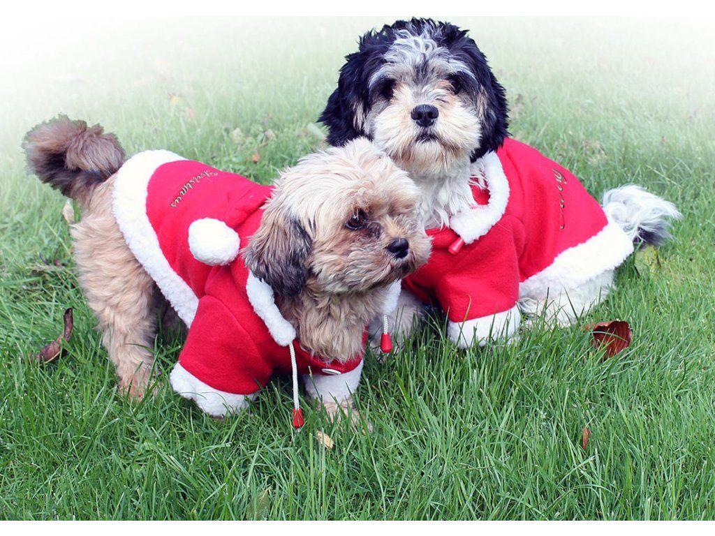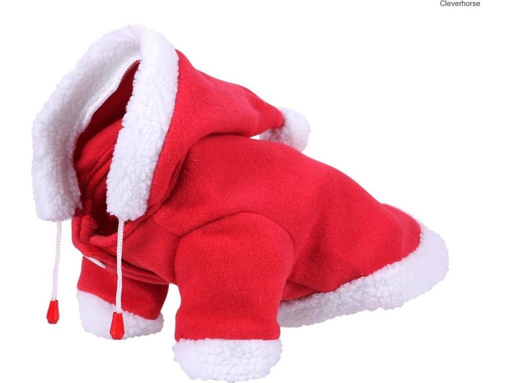 Roztomilý vianočný obliečok pre psov vo výraznej červenej farbe s bielym umelým kožušinovým lemom. Zapínanie na suchý zips a ozdobný gombík. Zdobený nápisom "Veselé Vianoce".