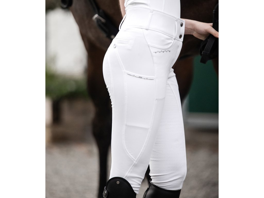 Kvalitné jazdecké rajtky so silikónovým protišmykovým gripom po celej dĺžke sedu. Vysoký pás pre maximálne pohodlie pri nosení. Vyrobené z veľmi priedušného bi-elastického a pohodlného materiálu, osvedčené mikrovlákna - kompresný efekt. Nohavice zakončené lycrou. Rajtky majú ozdobné zadné vrecká, bočné vrecko na mobilný telefón a praktické predné vrecká zdobené kamienkami. Pútka na opasok nesmú chýbať.