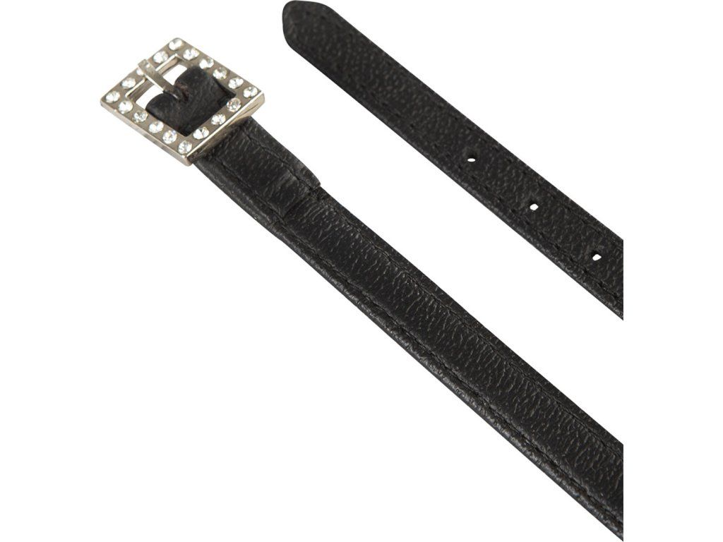 Remienky k šporniam vyrobené z vysokokvalitnej kože, aby sa zabezpečila maximálna odolnosť v priebehu času. Sú nastaviteľné, aby perfektne sedeli na ostrohu a umožnili pohodlie a stabilitu. Zapínanie je striebornej farby, zdobené trblietavými kamienkami. Vhodné pre všetky typy anglických ostrôh. Dodávané v páre. K dispozícii vo viacerých variantoch. Vyrábajú sa v jednej veľkosti.