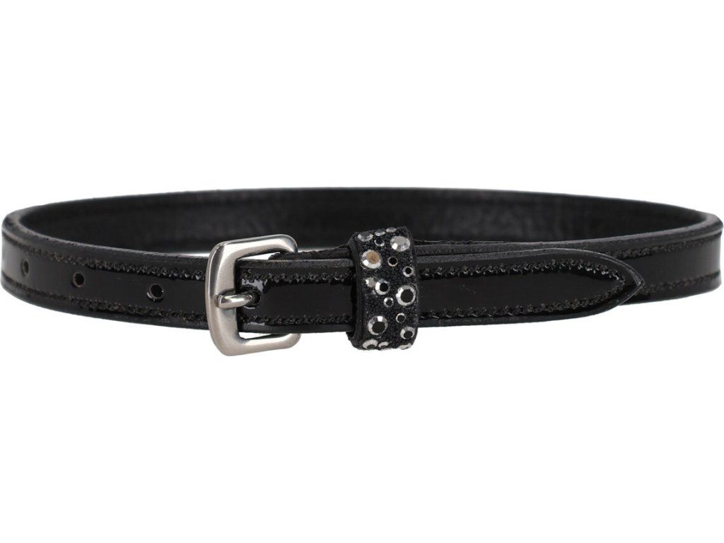 Čierne lakované remienky k šporniam so striebornou prackou z nerezovej ocele zaujmú elegantným vzhľadom. Sú vyrobené z kože a zakončené semišovým posuvným pútkom zdobeným kombináciou veľkých a malých kamienkov. Remienky majú štandardnú dĺžku 46 cm a vďaka klasickej pracke z nerezovej ocele umožňujú jednoduché a bezpečné zapnutie.