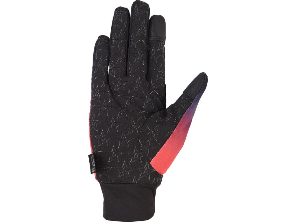 Stylové rukavice s barevným přechodem kombinují moderní design s funkčními detaily pro maximální komfort při nošení. Jsou vybavené reflexním potiskem loga a celoplošným protiskluzovým gripem ve tvaru hvězd na vnitřní straně, který zajišťuje jistý úchop otěží. V oblasti palce a ukazováčku jsou vybaveny materiálem, který je kompatibilní s dotykovou obrazovkou, lze s nimi proto snadno ovládat telefon.