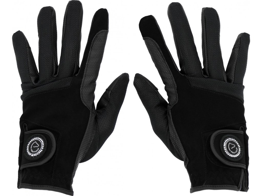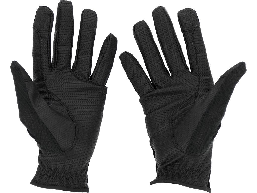 Strečové a priedušné jazdecké rukavice z elastanu so sieťovanými vložkami poskytujú maximálny komfort a priedušnosť. Praktické zapínanie na suchý zips zaisťuje rýchle a pohodlné nasadenie, zatiaľ čo elastická manžeta sa skvele prispôsobí tvaru zápästia. Vystuženie umiestnené na ukazováku a palci zvyšujú odolnosť a funkčnosť rukavíc. Rukavice sú kompatibilné s dotykovou obrazovkou.