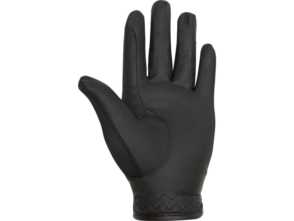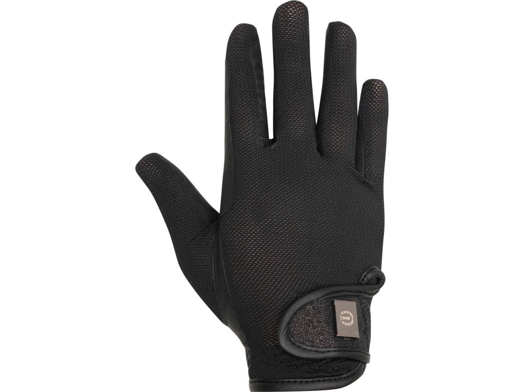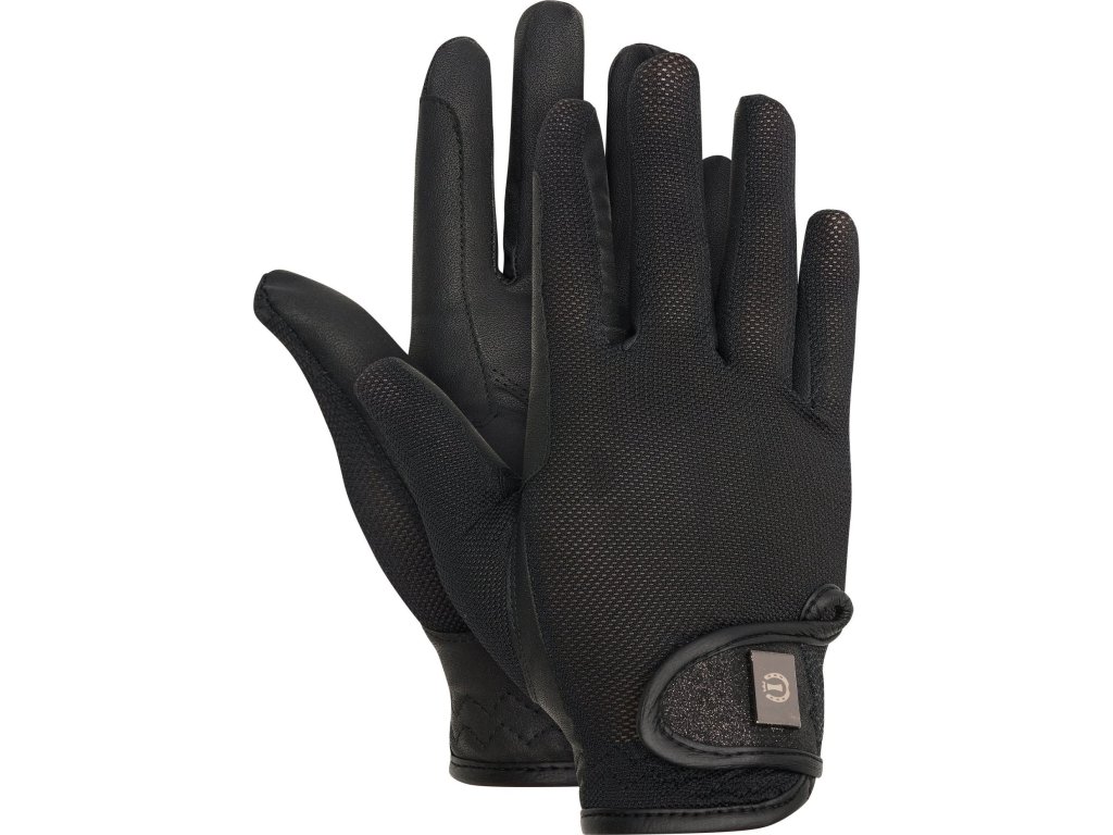 Tieto rukavice boli navrhnuté pre maximálne pohodlie a štýl počas teplých letných dní v sedle. Sú vyrobené z veľmi priedušného sieťového materiálu, ktorý umožňuje voľný priechod vzduchu a udržuje ruky chladné a suché aj pri intenzívnom tréningu. Rýchloschnúca tkanina zaisťuje pocit sviežosti a komfortu po celú dobu nosenia. Materiál v oblasti dlane z jemnej syntetickej kože poskytuje spoľahlivý úchop oťaží a istotu pri každom pohybe. Vďaka elastickému materiálu v oblasti zápästia a nastaviteľnému zapínaniu na suchý zips rukavice dokonale sadnú. Štýlový prvok v podobe trblietavého detailu s kovovou doštičkou dodáva rukaviciam elegantný vzhľad.