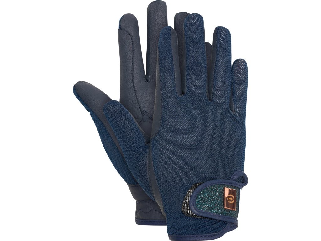Tieto rukavice boli navrhnuté pre maximálne pohodlie a štýl počas teplých letných dní v sedle. Sú vyrobené z veľmi priedušného sieťového materiálu, ktorý umožňuje voľný priechod vzduchu a udržuje ruky chladné a suché aj pri intenzívnom tréningu. Rýchloschnúca tkanina zaisťuje pocit sviežosti a komfortu po celú dobu nosenia. Materiál v oblasti dlane z jemnej syntetickej kože poskytuje spoľahlivý úchop oťaží a istotu pri každom pohybe. Vďaka elastickému materiálu v oblasti zápästia a nastaviteľnému zapínaniu na suchý zips rukavice dokonale sadnú. Štýlový prvok v podobe trblietavého detailu s kovovou doštičkou dodáva rukaviciam elegantný vzhľad.
