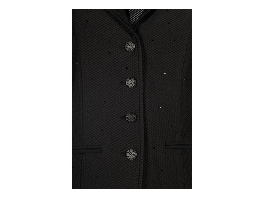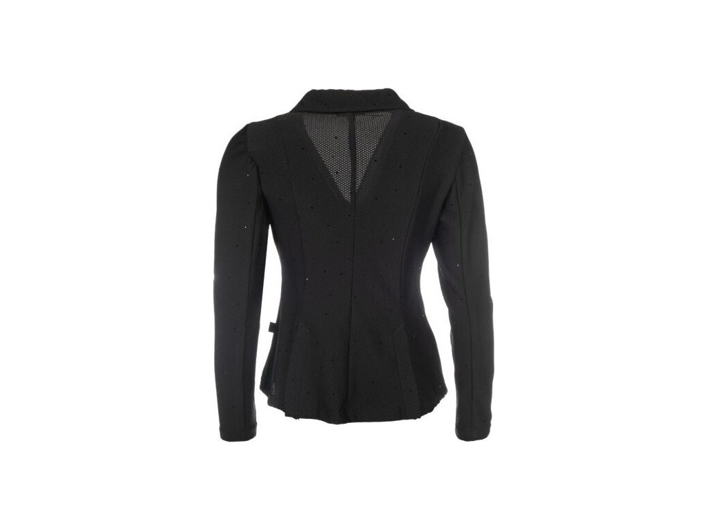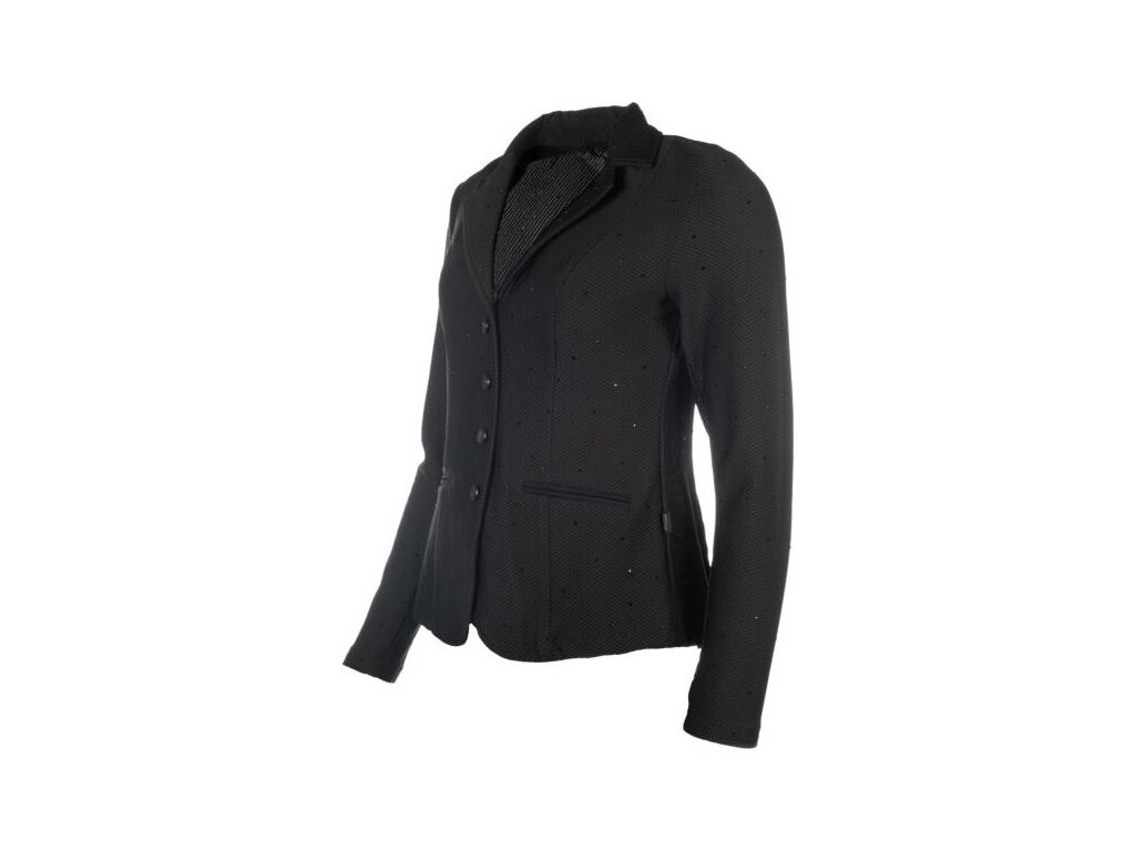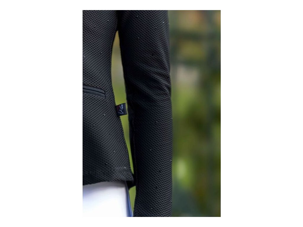 Sako na preteky, ktoré kombinuje vysoký komfort a elegantný dizajn. Vyrobené z elastického a vysoko priedušného sieťového materiálu, vďaka čomu je ideálne na horúce letné dni. Materiál sa nekrčí, takže sako stále vyzerá upravene. Poskytuje maximálnu voľnosť pohybu pre čo najlepší jazdecký výkon. Skrytý zips pod légou s gombíkmi a jemné zdobenie kamienkami dodávajú saku elegantný nádych. Priliehavý strih spolu s integrovanými rozparkami zaisťuje optimálne pohodlie pri jazdení. Ďalej je vybavené dvoma zadnými jazdeckými rozparkami a dvoma prednými vreckami. Možno prať v práčke pri 30 °C na jemnom cykle.