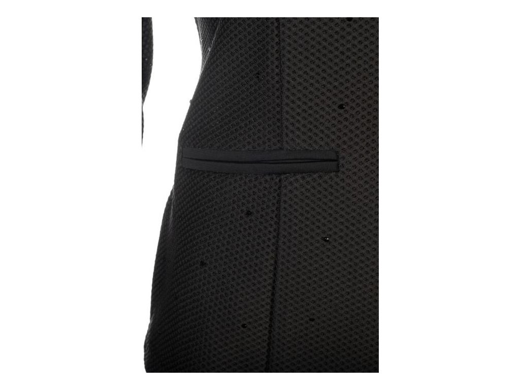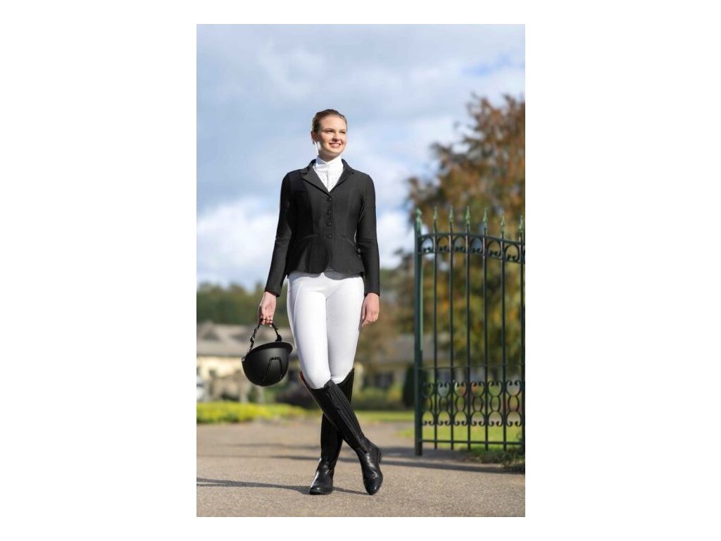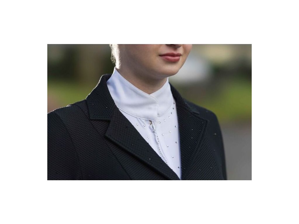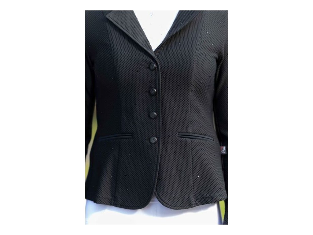 Sako na preteky, ktoré kombinuje vysoký komfort a elegantný dizajn. Vyrobené z elastického a vysoko priedušného sieťového materiálu, vďaka čomu je ideálne na horúce letné dni. Materiál sa nekrčí, takže sako stále vyzerá upravene. Poskytuje maximálnu voľnosť pohybu pre čo najlepší jazdecký výkon. Skrytý zips pod légou s gombíkmi a jemné zdobenie kamienkami dodávajú saku elegantný nádych. Priliehavý strih spolu s integrovanými rozparkami zaisťuje optimálne pohodlie pri jazdení. Ďalej je vybavené dvoma zadnými jazdeckými rozparkami a dvoma prednými vreckami. Možno prať v práčke pri 30 °C na jemnom cykle.